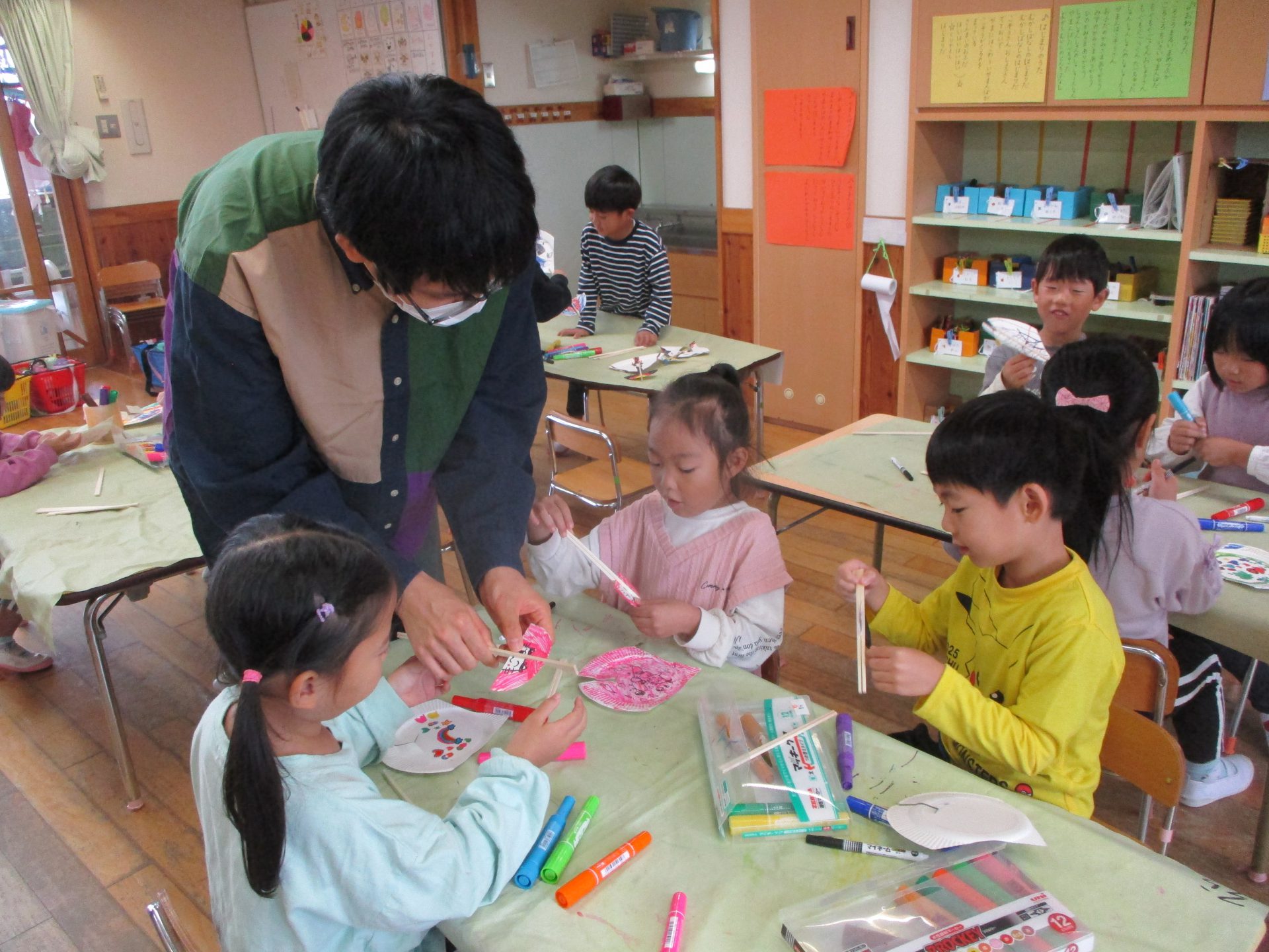次は、紙皿を割り箸に挟んでボンドで貼り付け。 難しいところは聞きながら一緒に仕上げていきます。