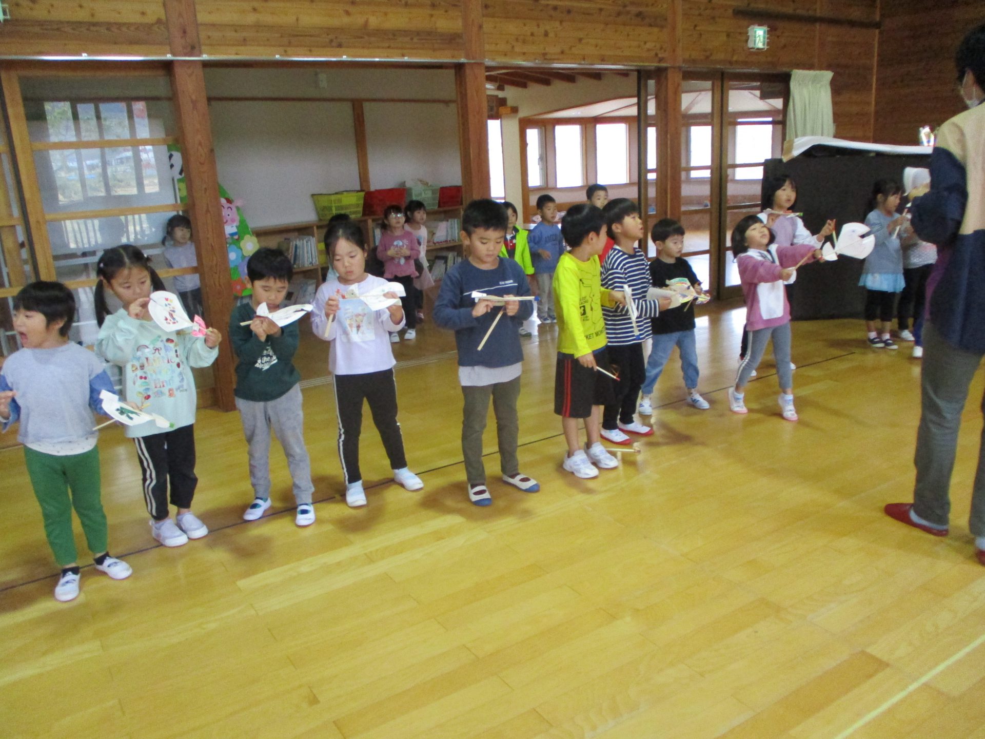 いよいよ完成です。 出来上がった紙皿飛行機を持って遊戯室でさっそく飛ばしてみよう!