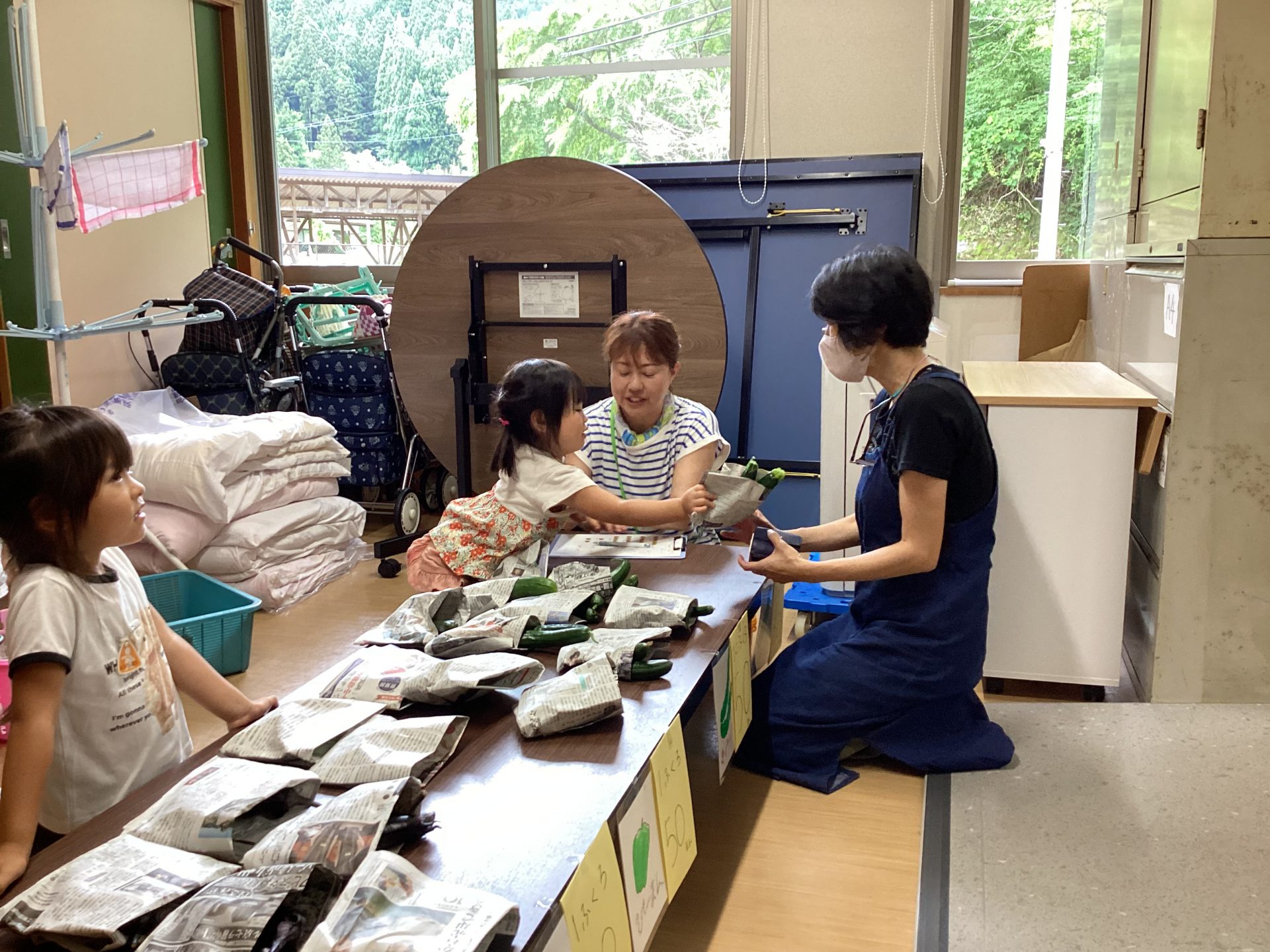 初めは一本ずつ売っていきましたが、収穫が増えてくると年中組が折った新聞紙の袋に入れて数本ずつまとめて売り始めました。