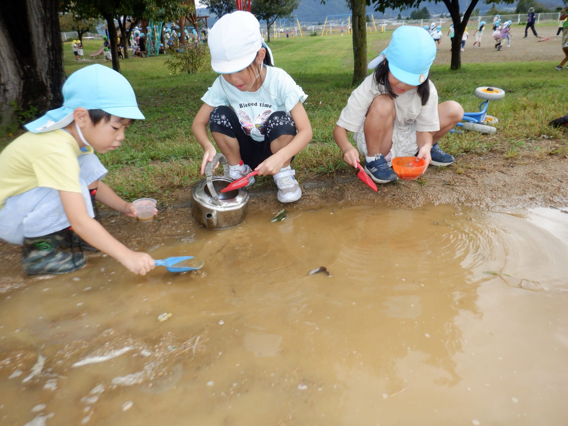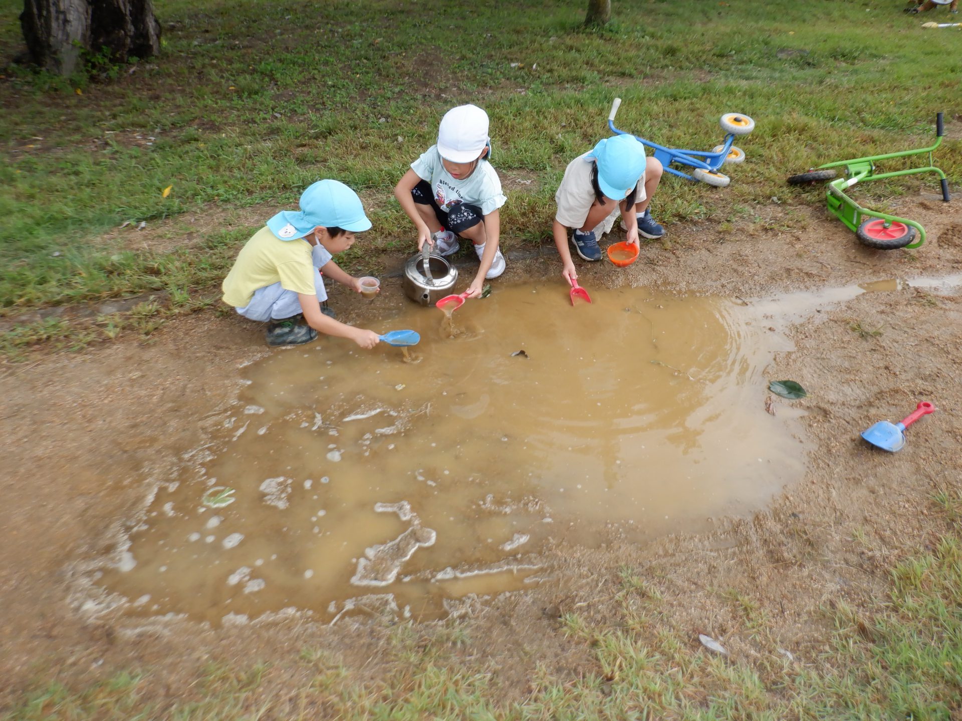 雨の降った翌日、園庭に大きな水たまりができていました。