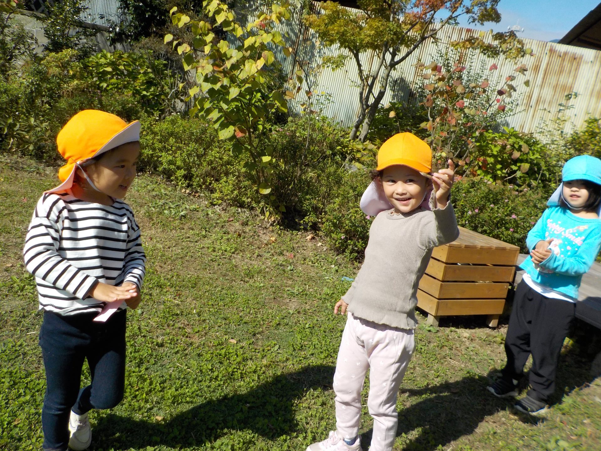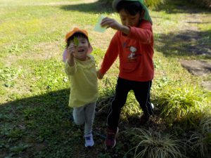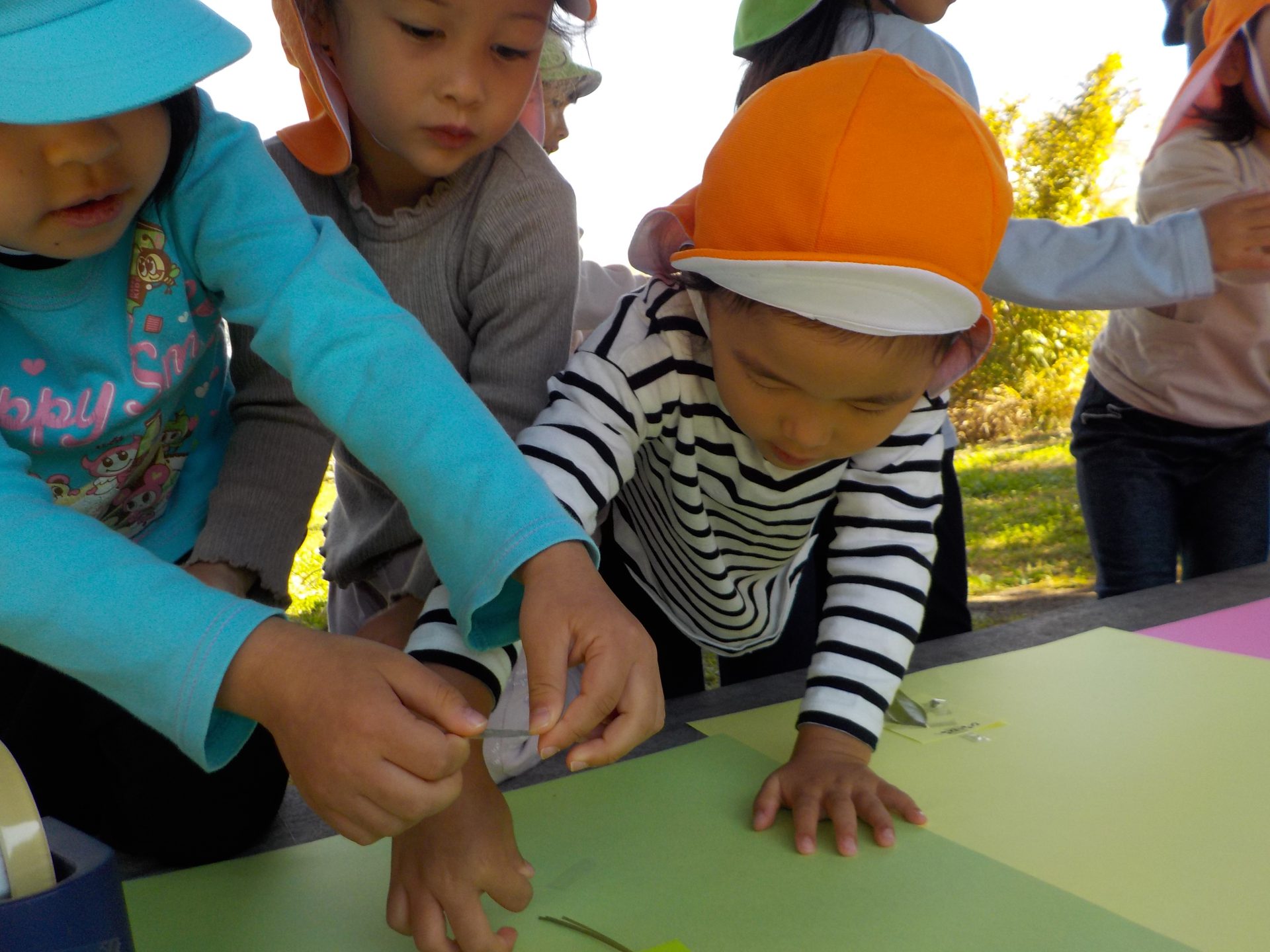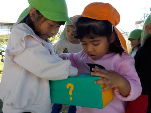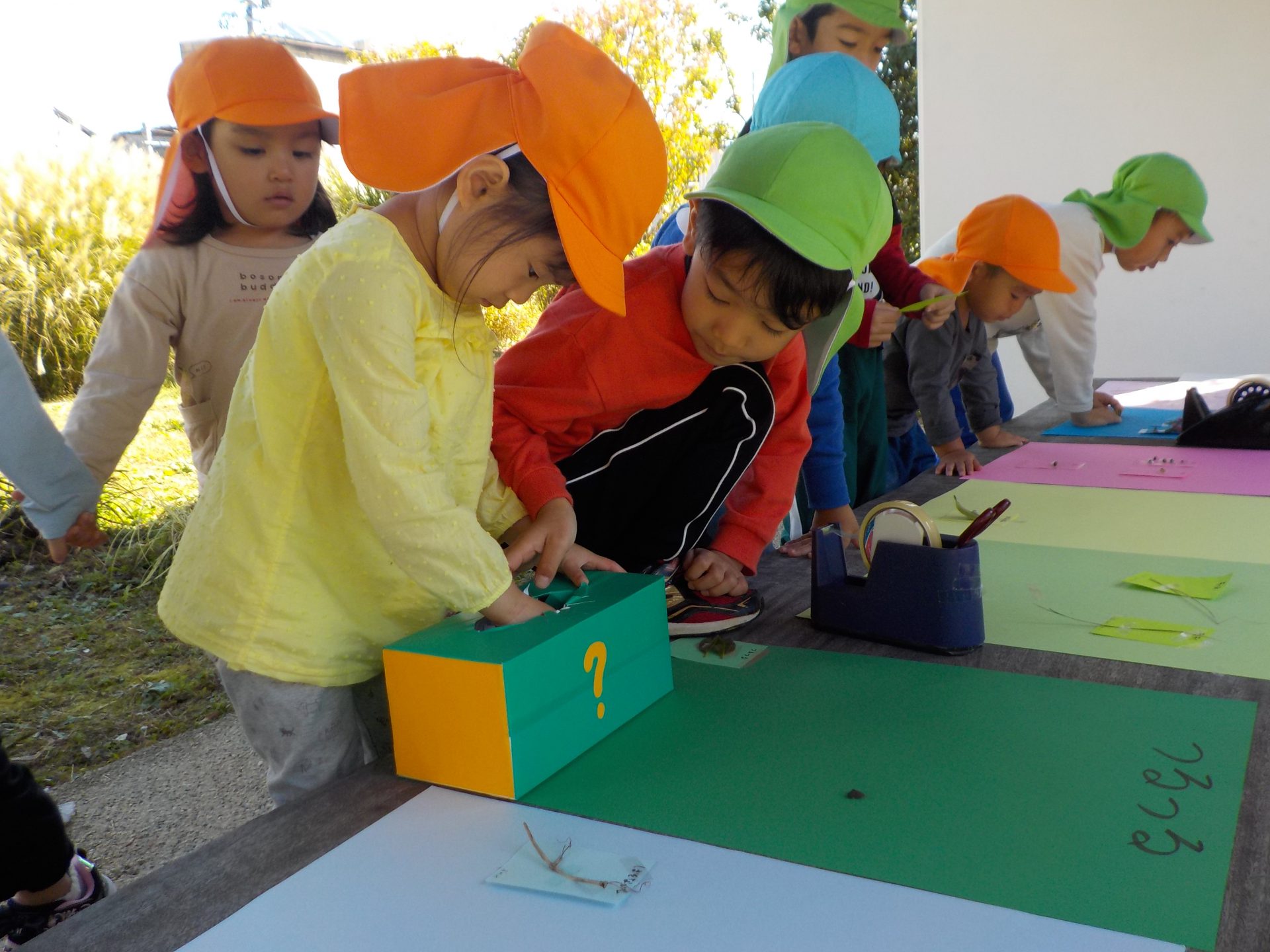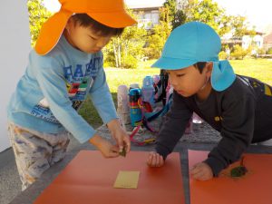今日は春草公園へ行き、ネイチャーゲーム(五感を使って自然を直接体験する野外活動)を楽しんできました。保育士が用意したハテナ?ボックスにはカードが入っていて、異年齢ペアのお友達と一緒にカードを引きます。「ふわふわ」と書いてあると、子ども達はそれを探しに行くゲームです。それぞれ見つけたものを嬉しそうに保育士に見せてくれたり、種類ごと画用紙に貼りました。次々に自然物を見つけ、楽しんでいた子ども達で、異年齢のお友達とも仲良く遊ぶ姿が見られました。