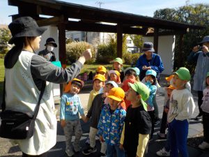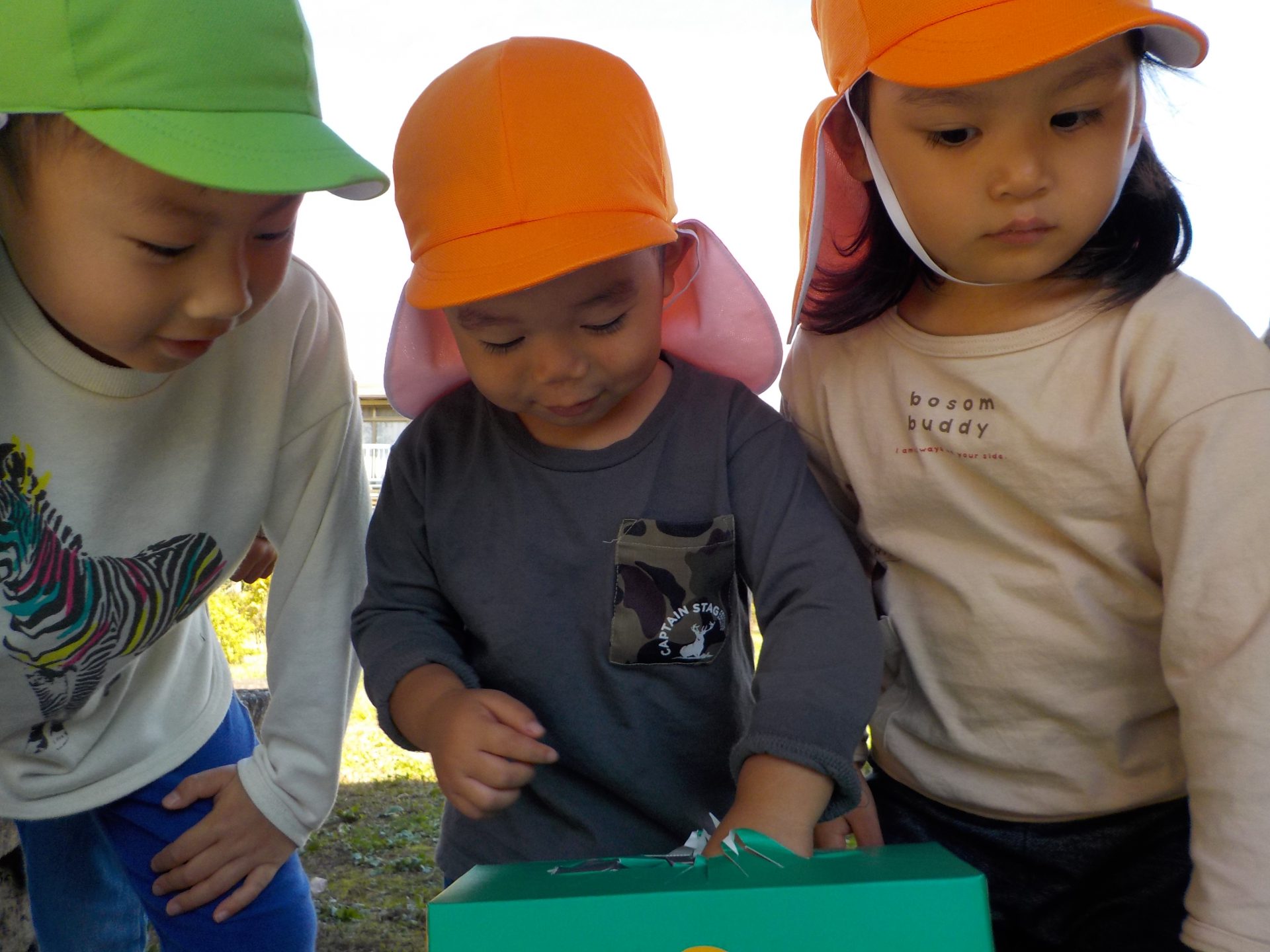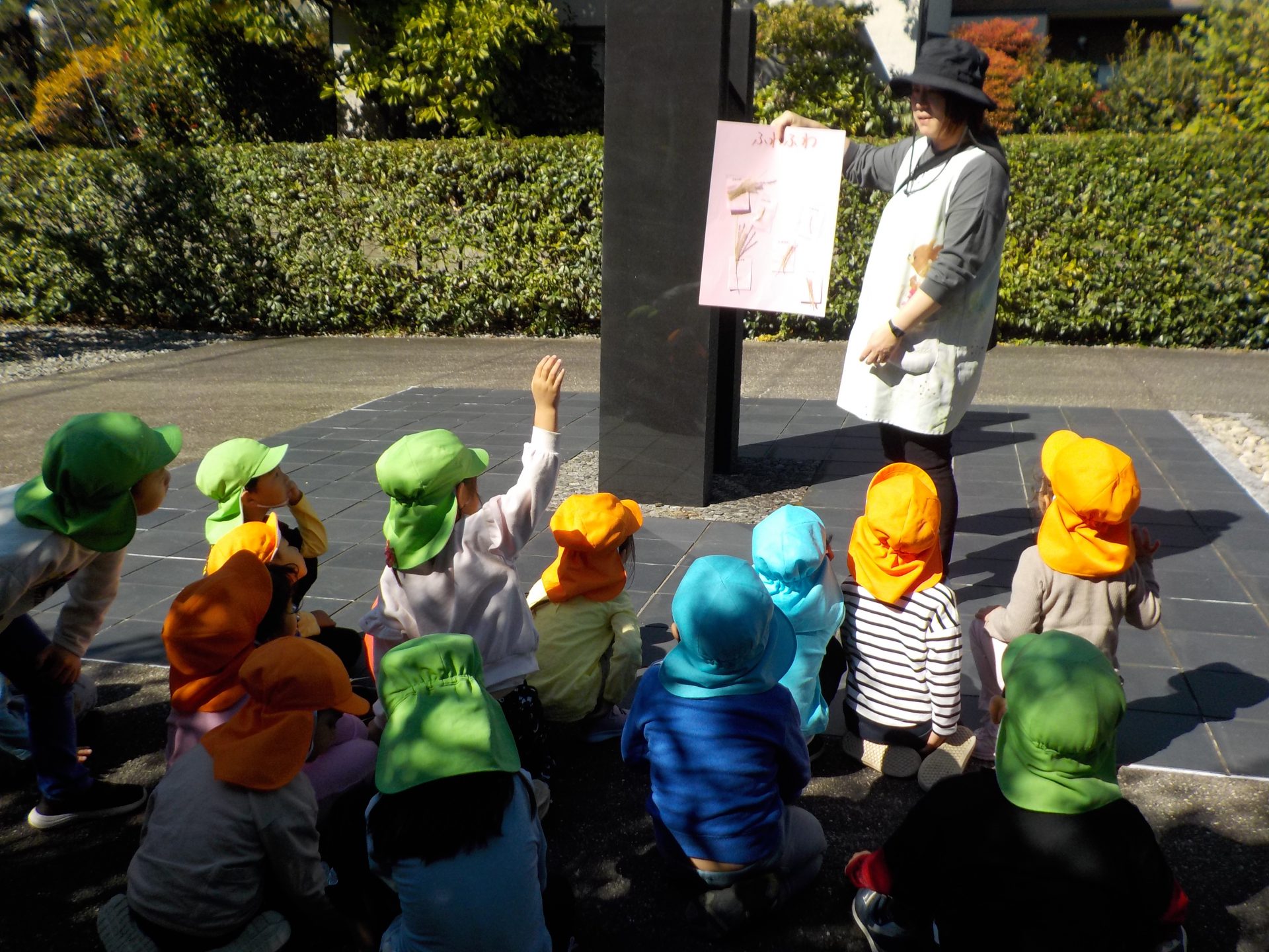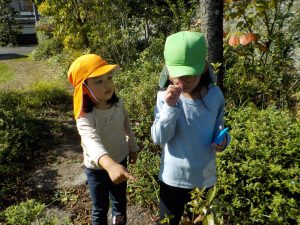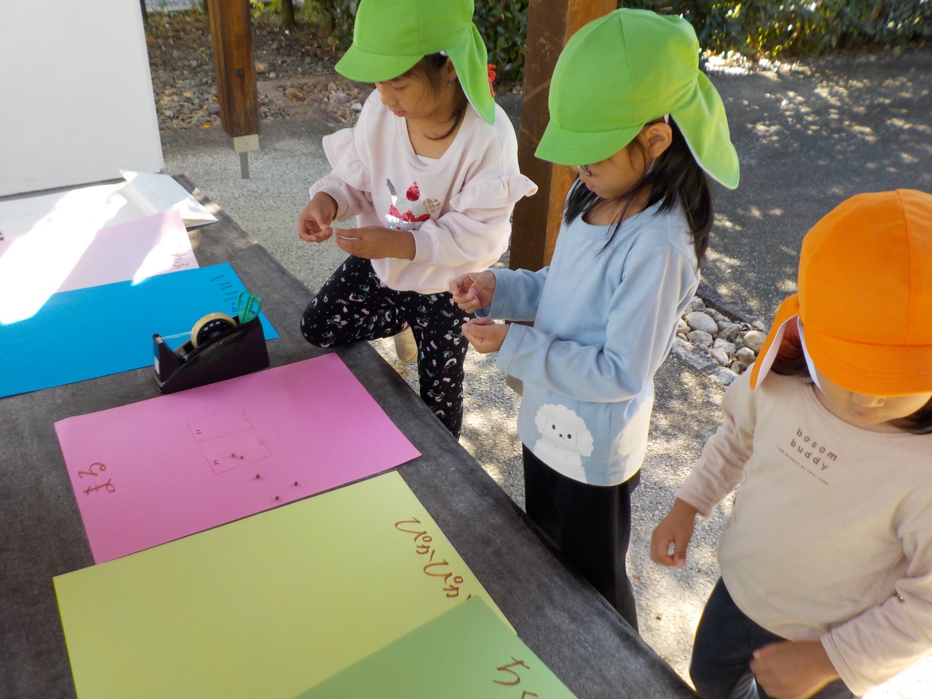 今日は春草公園へ行き、ネイチャーゲーム(五感を使って自然を直接体験する野外活動)を楽しんできました。保育士が用意したハテナ?ボックスにはカードが入っていて、異年齢ペアのお友達と一緒にカードを引きます。「ふわふわ」と書いてあると、子ども達はそれを探しに行くゲームです。それぞれ見つけたものを嬉しそうに保育士に見せてくれたり、種類ごと画用紙に貼りました。次々に自然物を見つけ、楽しんでいた子ども達で、異年齢のお友達とも仲良く遊ぶ姿が見られました。