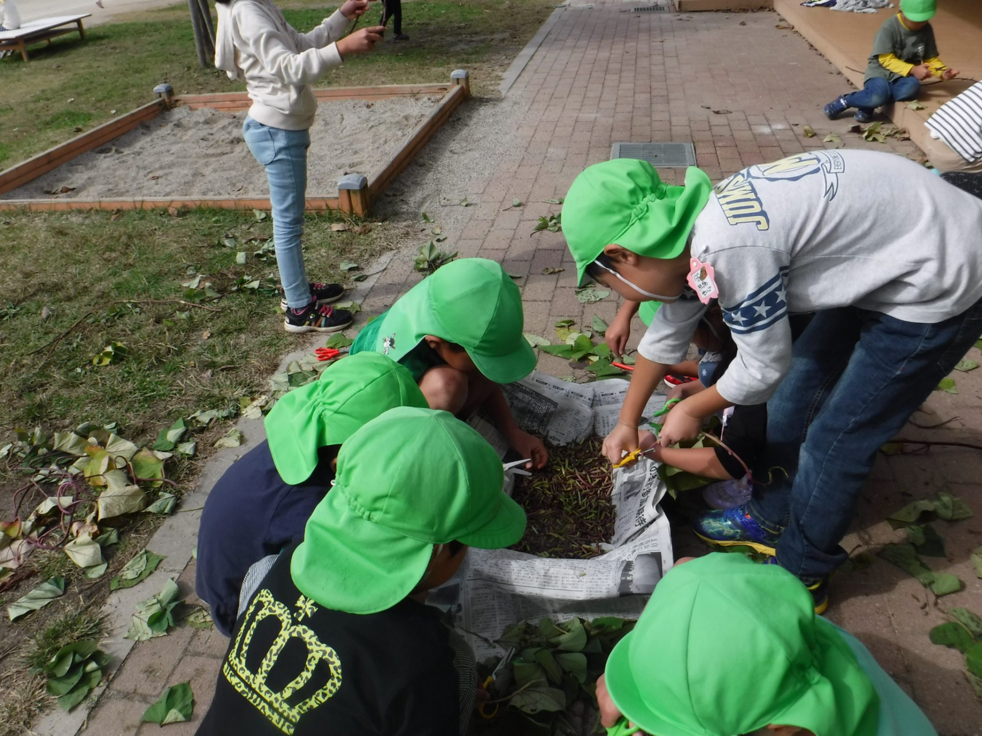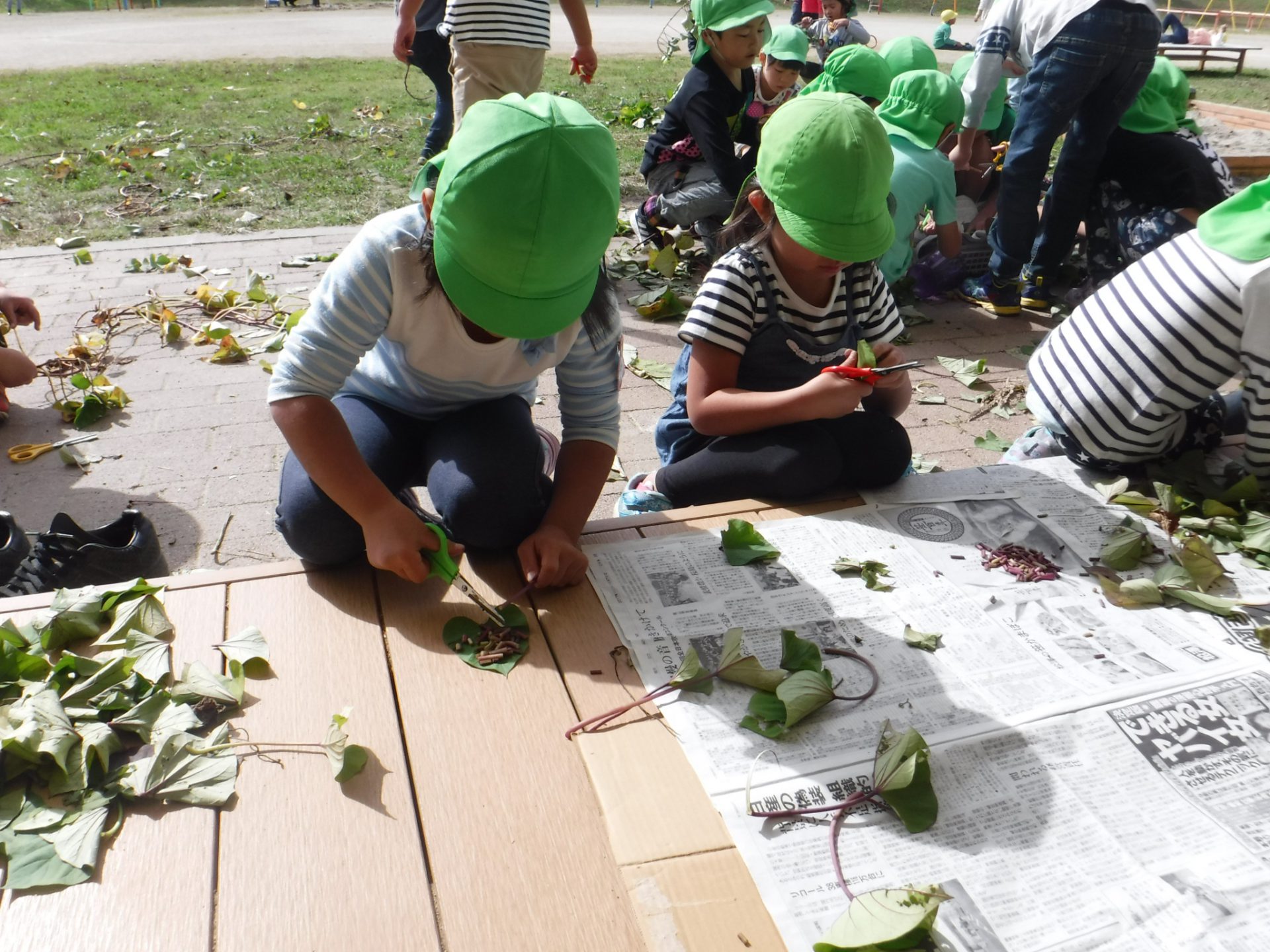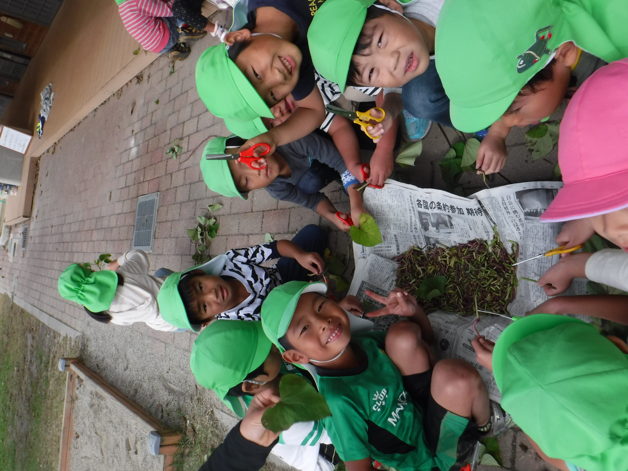 茎も食べられる事を知り、年長さんはハサミでチョキチョキ切りました。