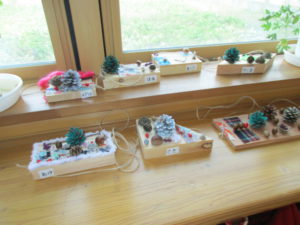 見つけた木の実や葉っぱを並べたり転がしたり、板や厚紙を見つけのせてみたり、布やビニール紐やテープを使いボンドで思い思いにつけ、自分の作品を作る事ができました。
