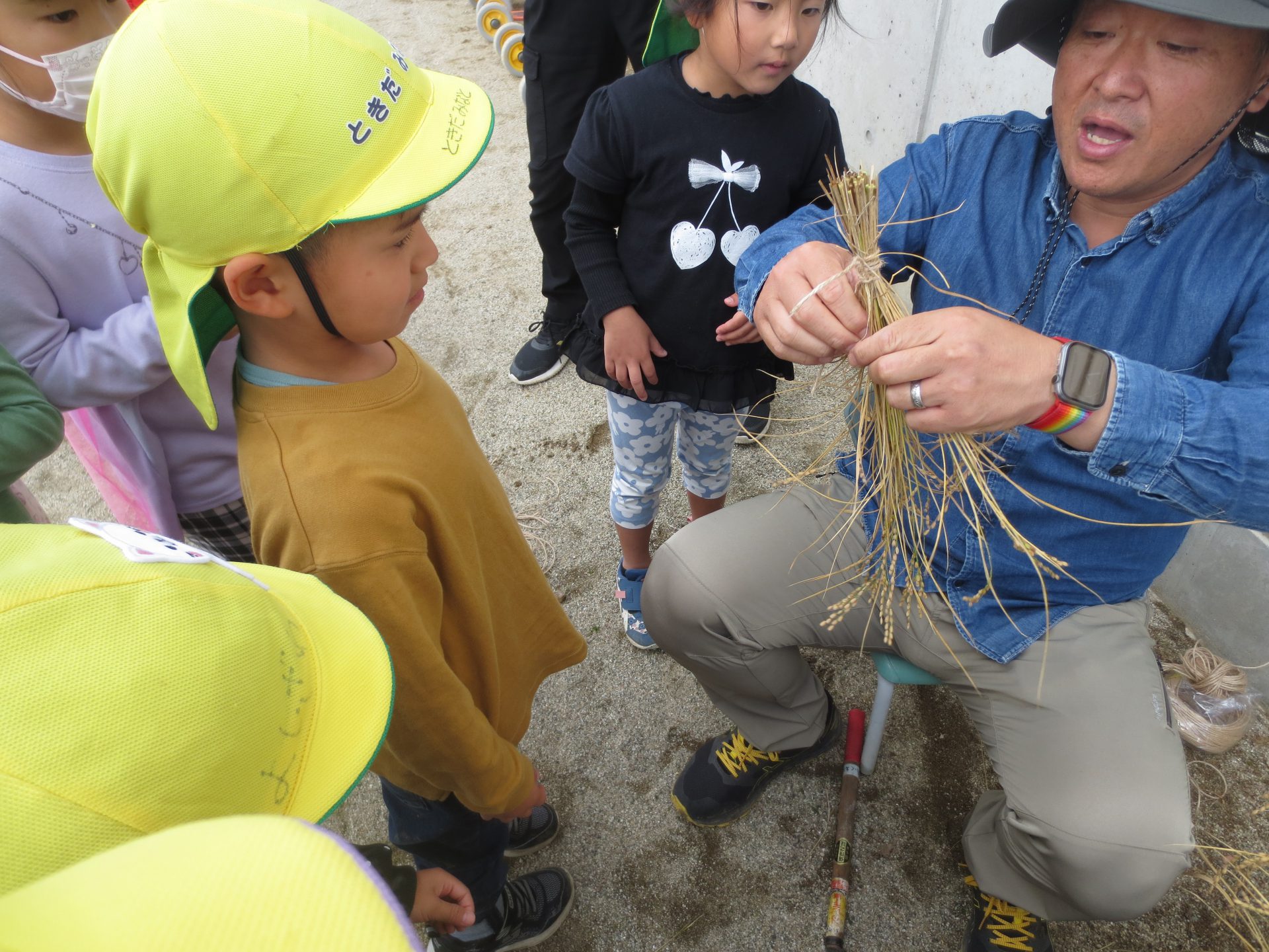 稲を束ねる様子を見て、さぁ挑戦です!!