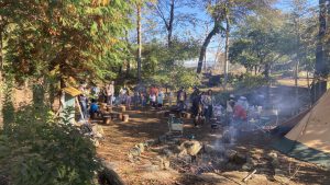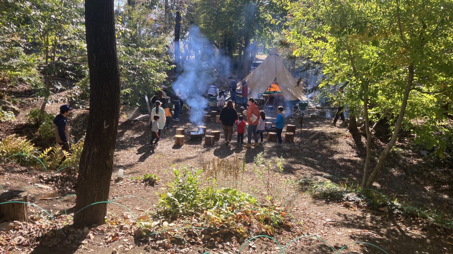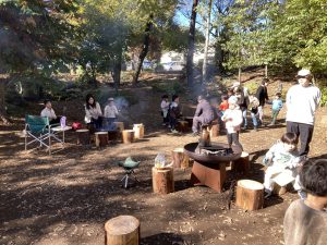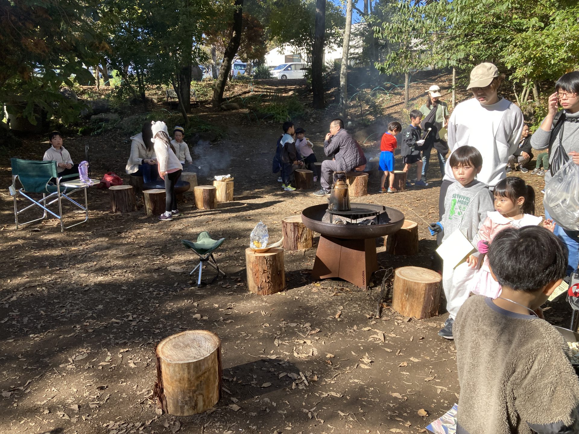 森のフィールドでは、焚き火コーナーと各ブースに分かれてお楽しみコーナとして親子で行いました。