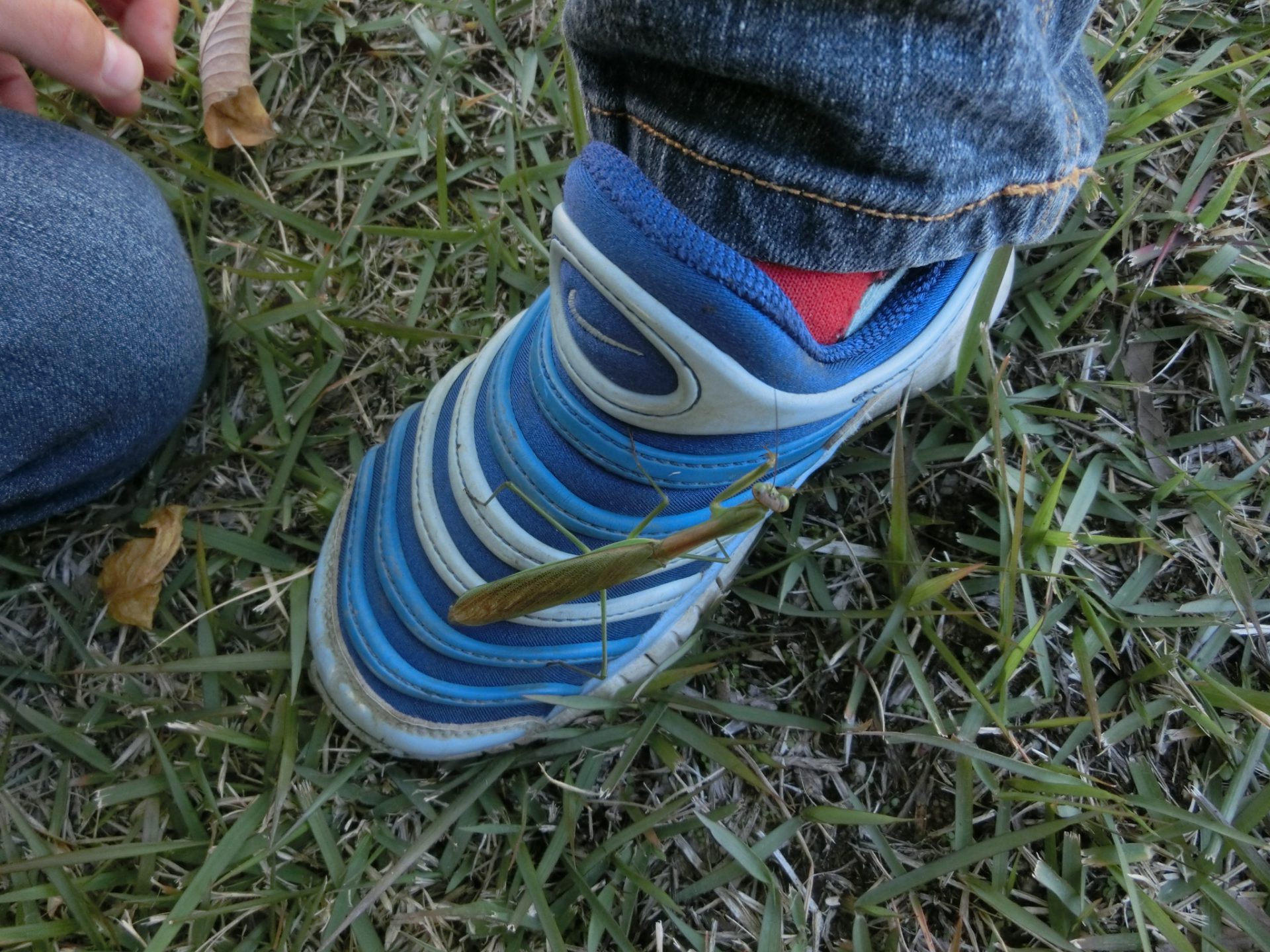 頑張ってくれたみんなのもとへ珍客が…。カマキリも楽しそうな声につられて会いに来たようです。