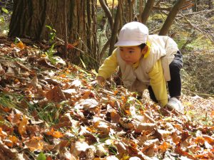 坂道の途中で「どんぐりは転がるのに葉っぱはどうして転がらないのかな?」