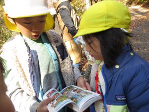 「きのこを見つけたら調べたい!」とお家から図鑑を持ってきました。