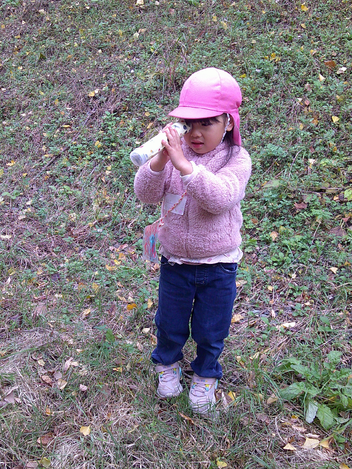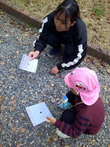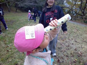 ・自然物を使った万華鏡は木の実でも枯れ枝でも、小石でもきれいにいろいろな形を見せてくれ、子どもたちはその不思議さや面白さを感じ、夢中になって覗き、「きれいだなぁ~。」「感激する~~~」など自然と言葉にして表現する様子はとてもうれしいすがただった。