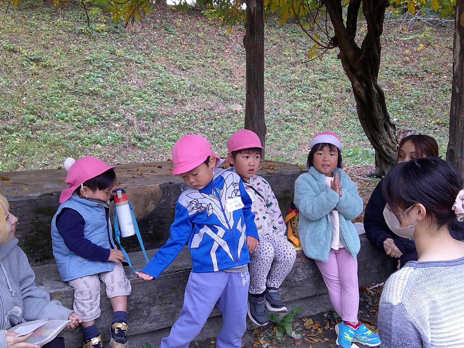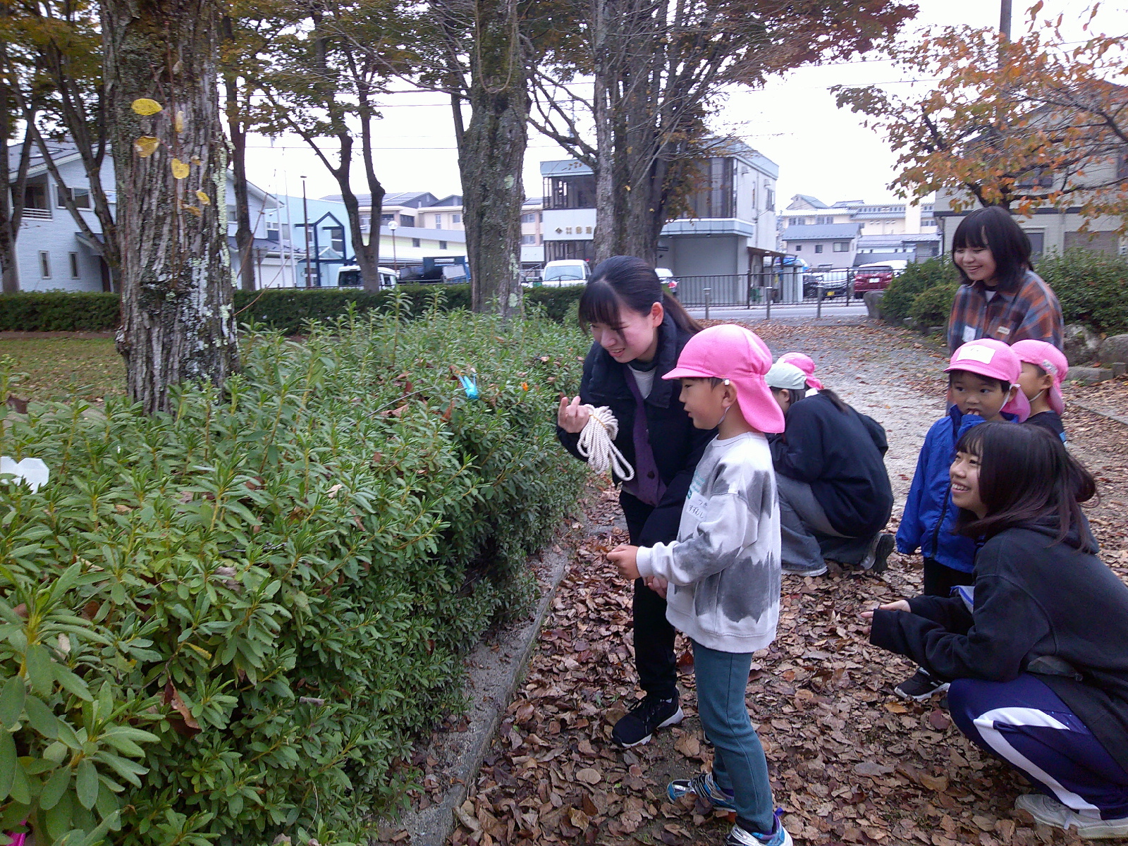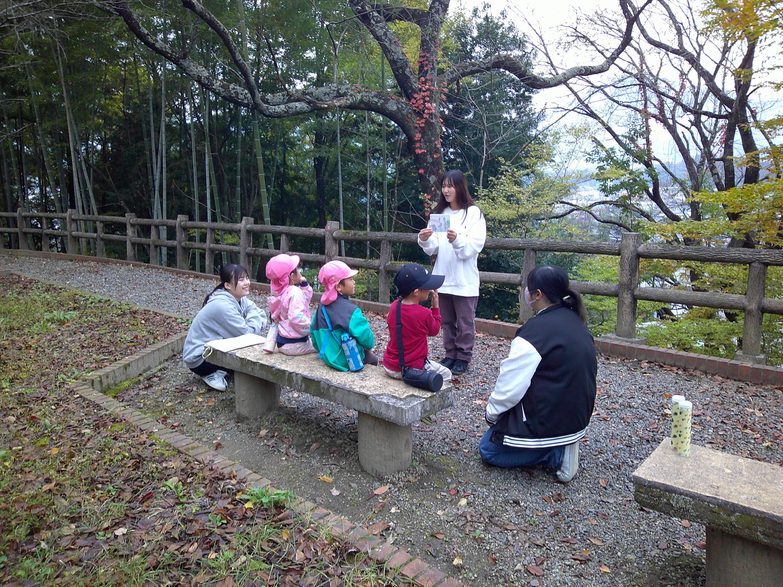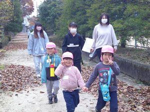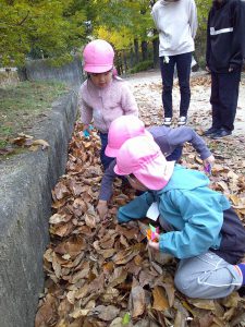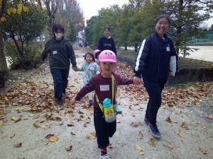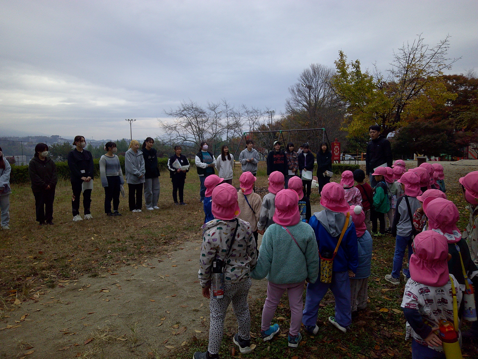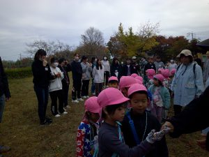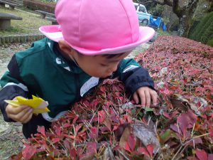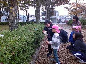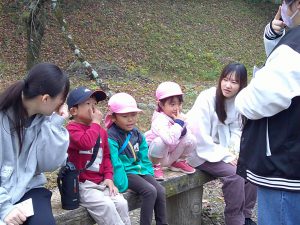 年中さんのお友だちと飯田短大の幼児教育科の生徒さんが地区にある矢高公園で自然保育の交流を行いました。