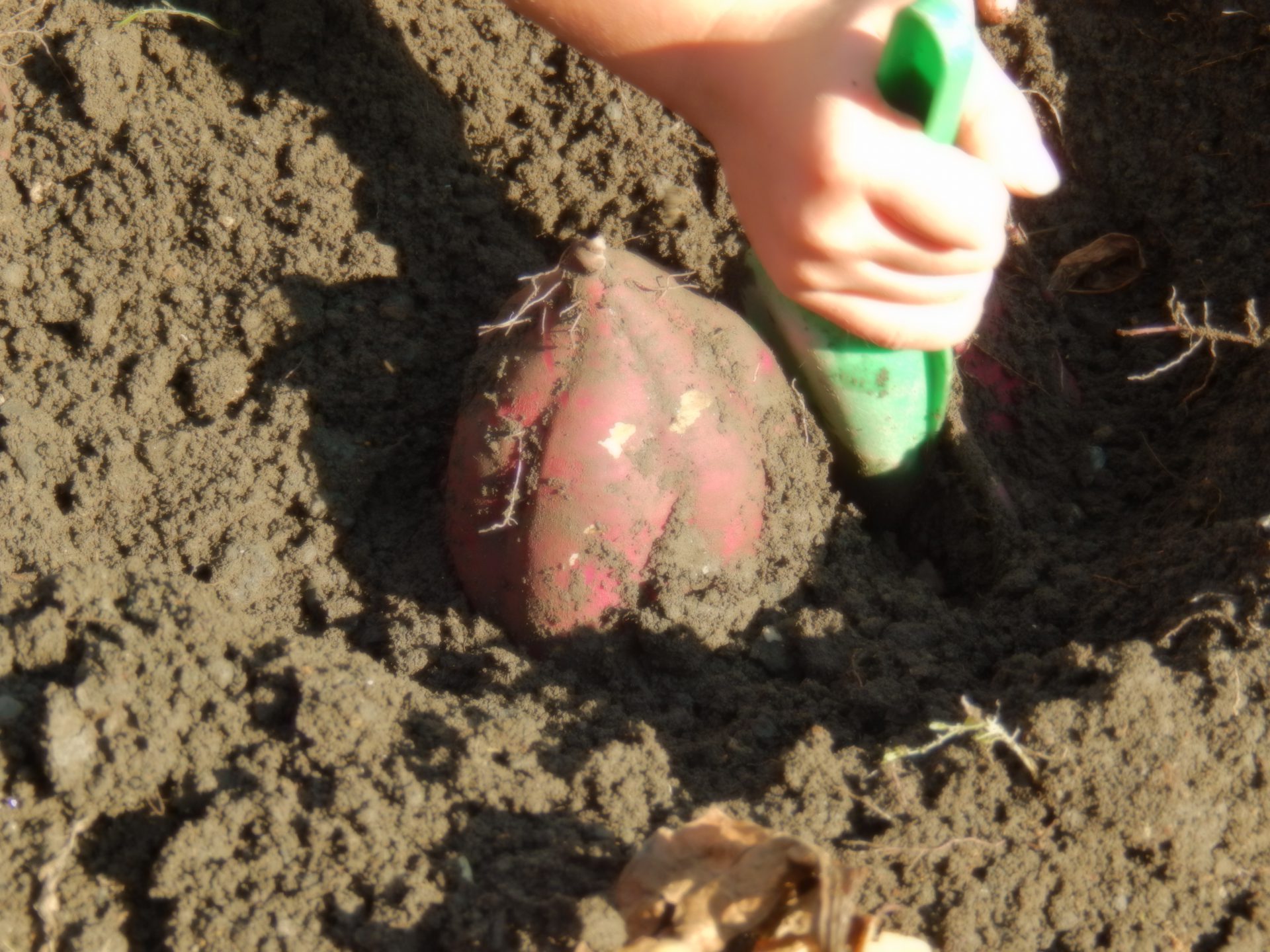 手を土だらけにして夢中になって掘っている子どもたち。「大きいお芋でてきたー!」「赤ちゃん芋だー!」「先生なかなか掘れないよー!」「虫もいたよ!」土との格闘の中で発見があり、会話が弾み楽しかったね。