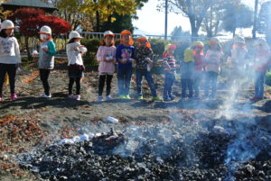 焼き芋会、たき火からは煙がもくもく。「けむいね!」「目が痛いね!」と子どもたち。