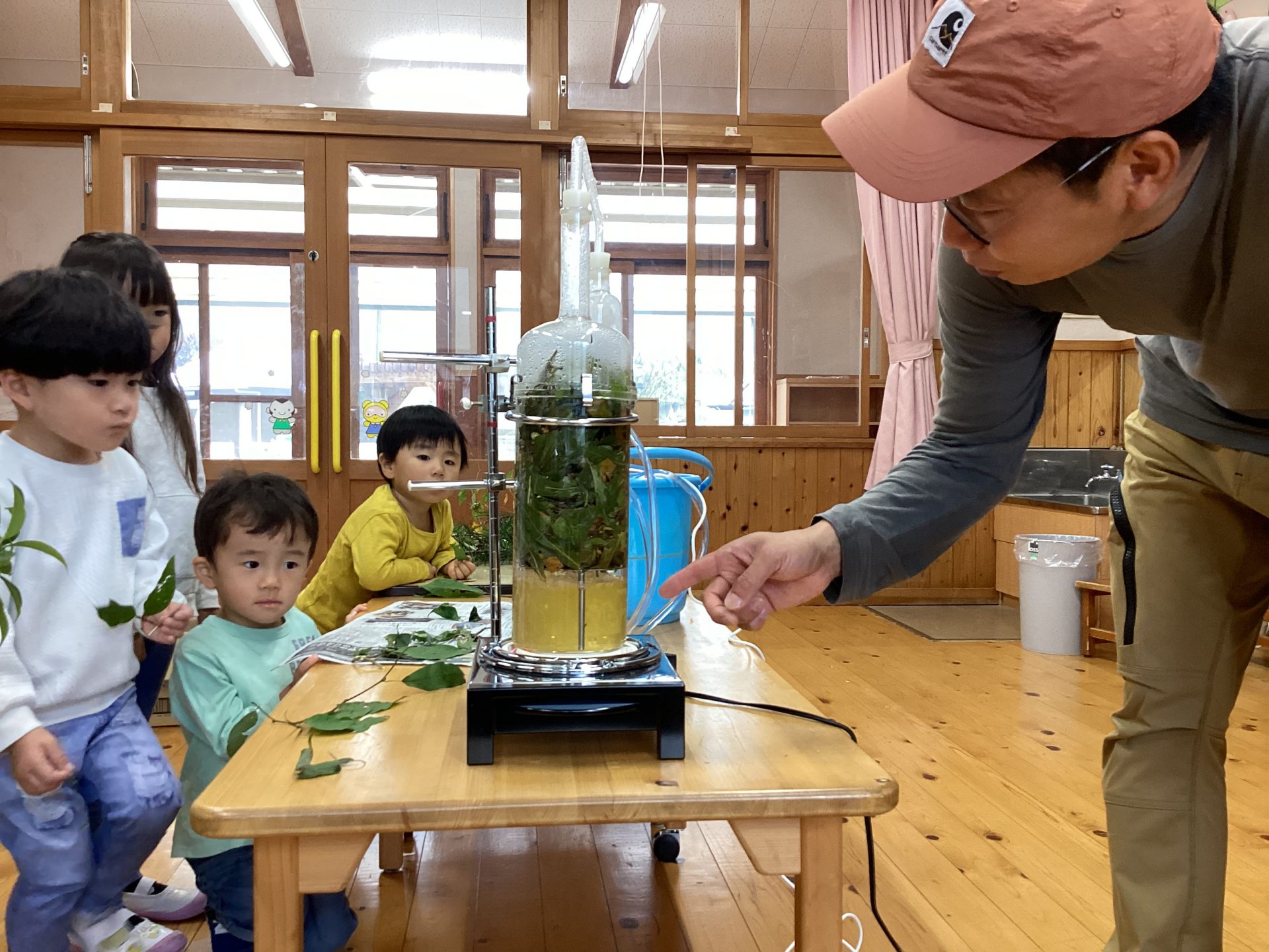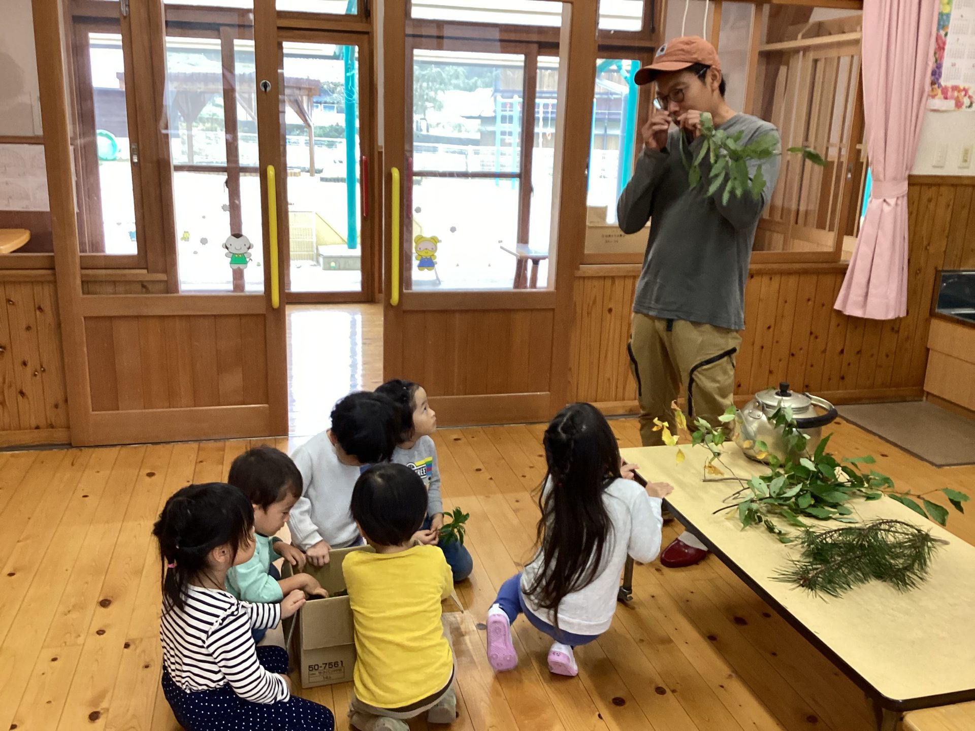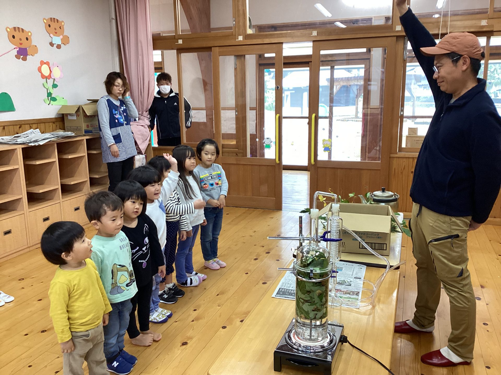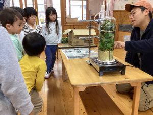 幸山さん「今日は根羽の森にある木を使った植物で、アロマウォーターを作ります。木にはいろんな匂いがあります。良い匂いが好きな人??」