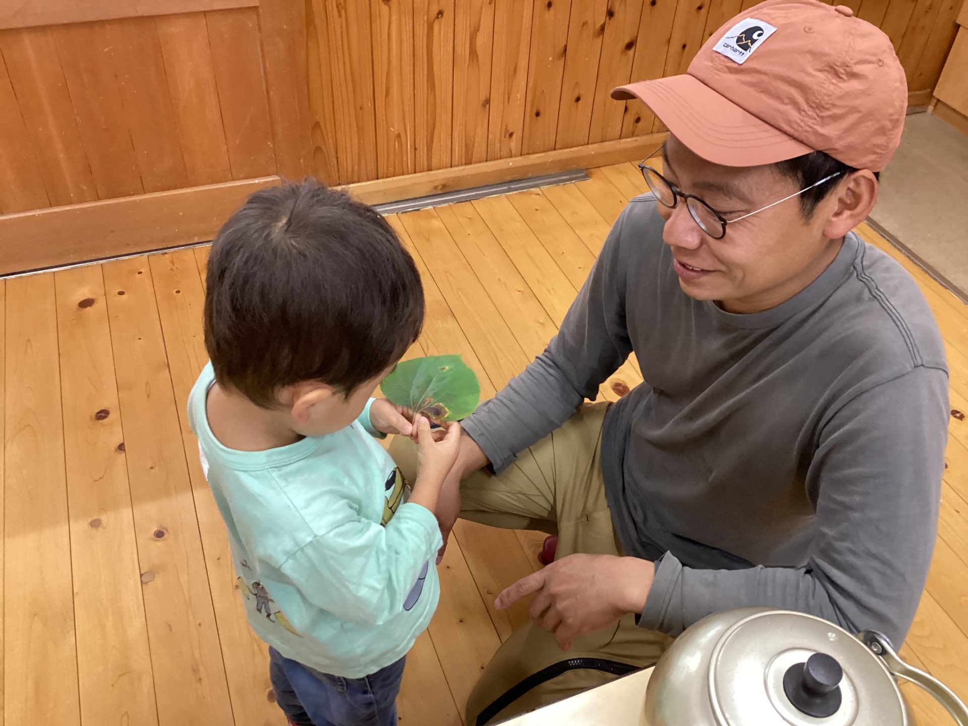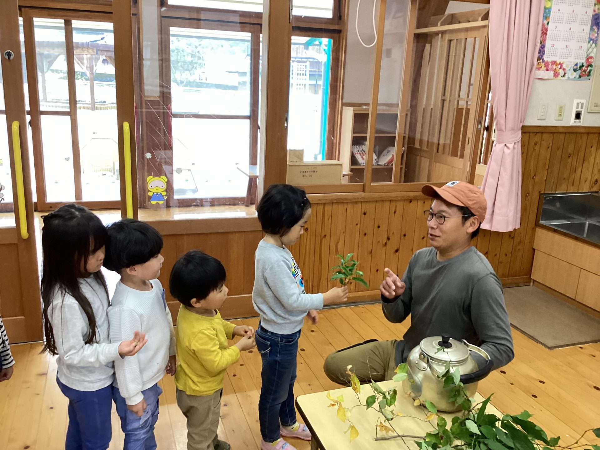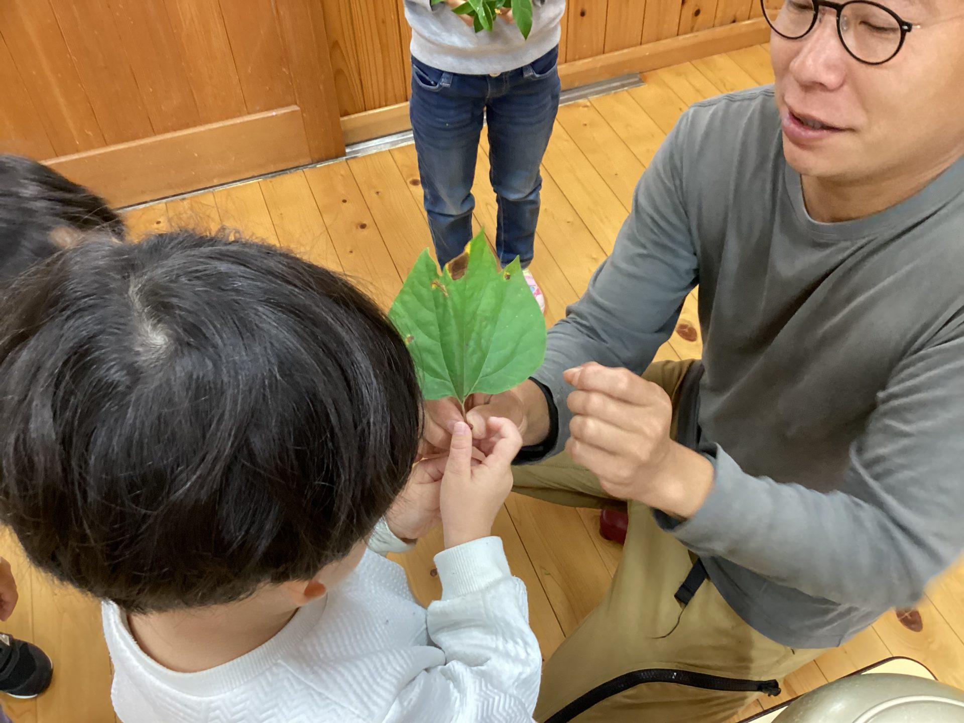 子ども「キンモクセイ」「アブラチャン」「ダンコウバイ」など一人ずつ葉っぱの名前を教えてもらいます。