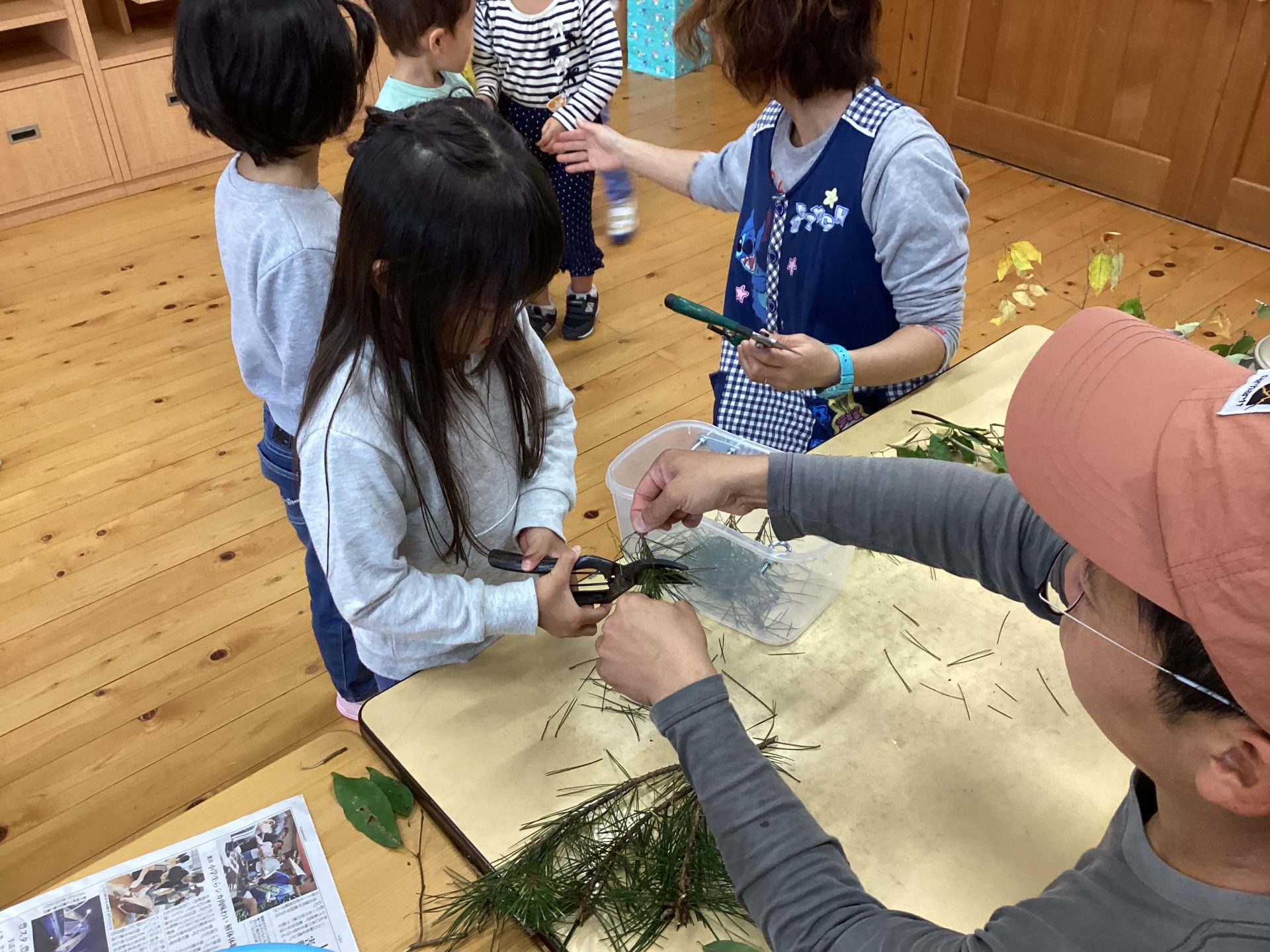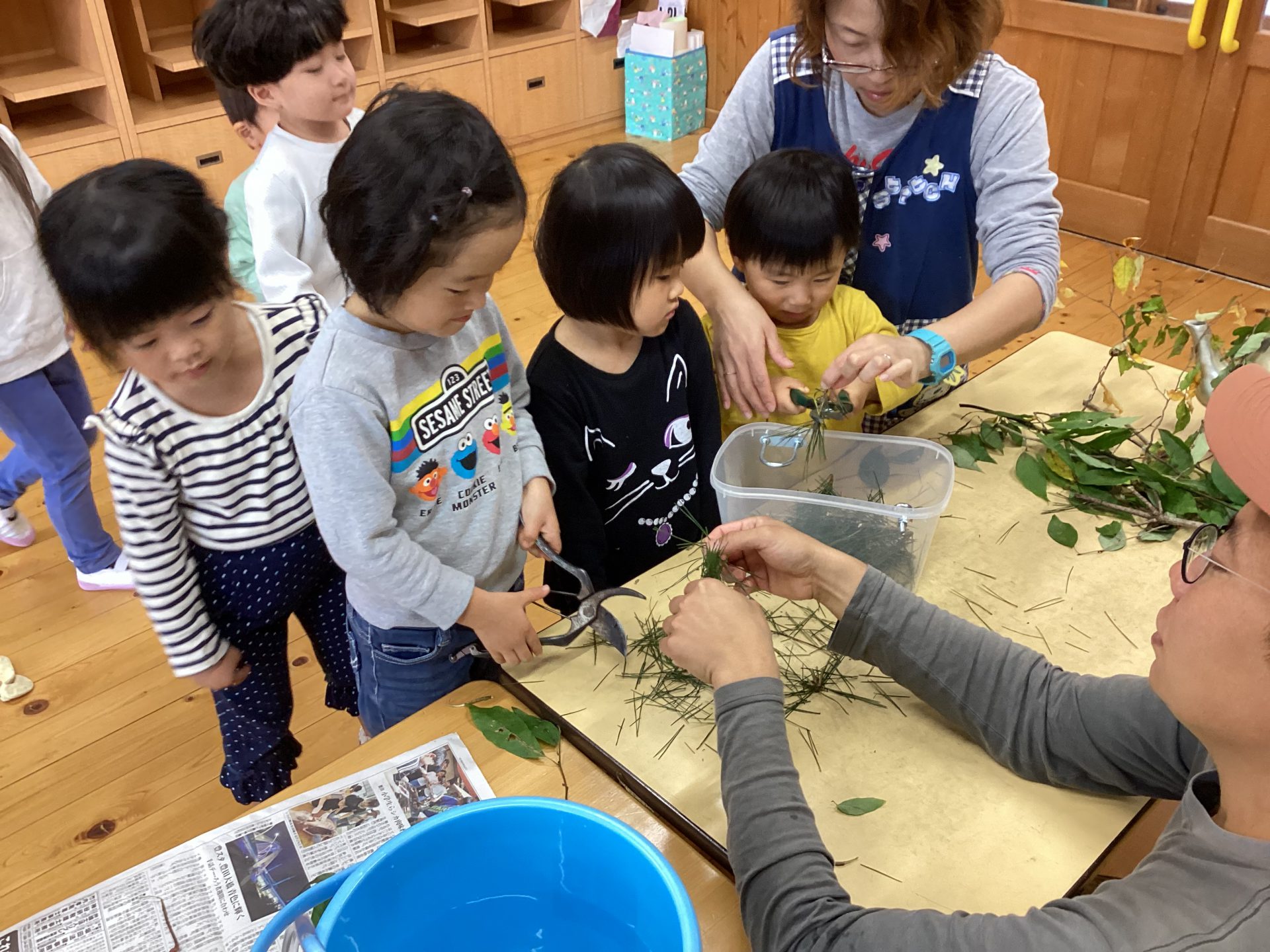 幸山さん「半分の丸をくっつけると〇になります。2枚の葉はニヨウマツ。5枚の葉はゴヨウマツと言います。植物はみんな規則正しい生き物です。では、松をカミカミしてみましょう」