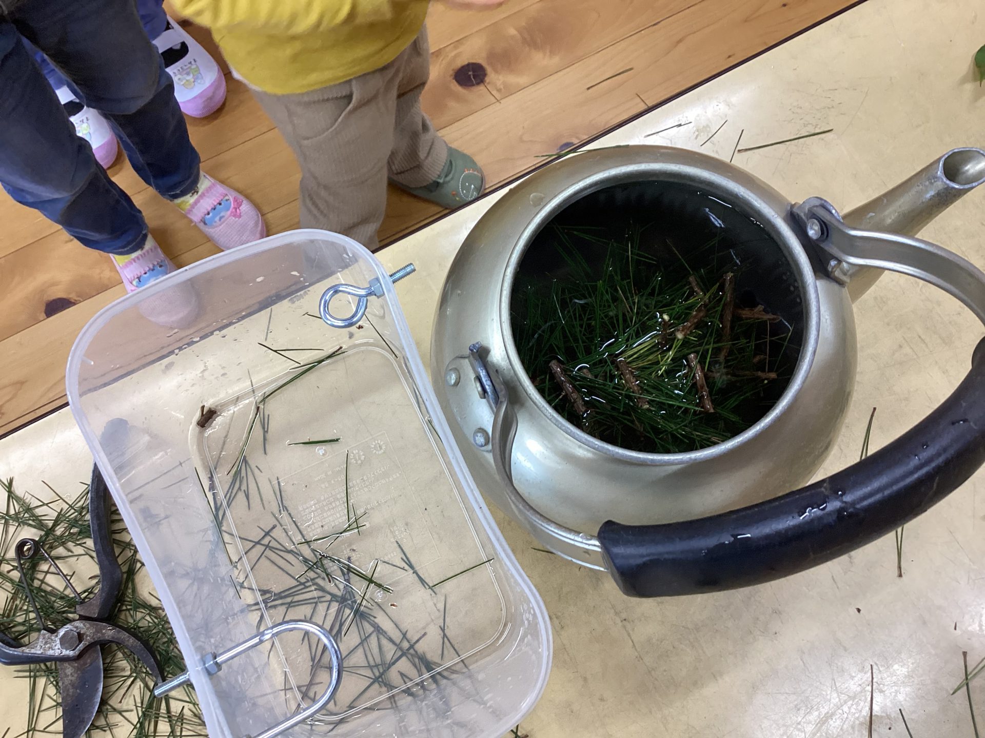 幸山さん「ヤカンの中に、松の木の枝を入れてください。これを火にかけて煮だします。出来上がったら、みんなで飲みたいと思います。松って、すごいエネルギーがあるんです!!松は、白髪が黒髪になりすま。戦争があった頃、兵士さんは食べ物がなくて脚気という病気が流行りました。その時、松をカミカミして治していました」
