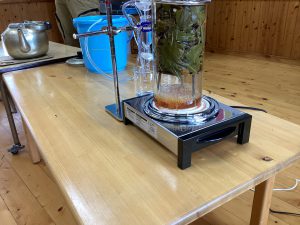 幸山さん「水滴が水で冷やされることによって、白っぽい水が出てくるのがわかりますか?これが、今日みんなが持って帰るアロマウォーターです。この水がなくなったら完成です。水がなくなるまで時間がかかるので、松のお茶を作ってみたいと思います」