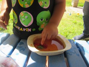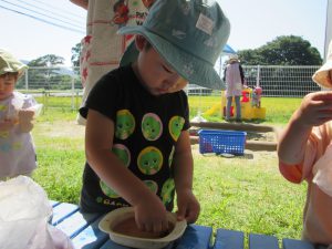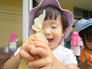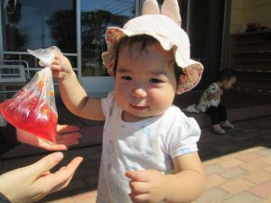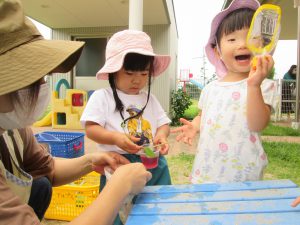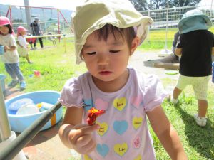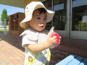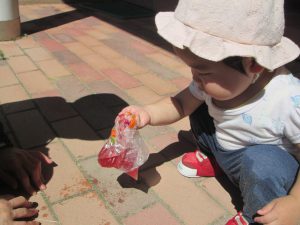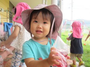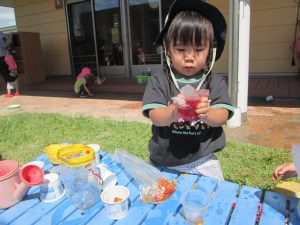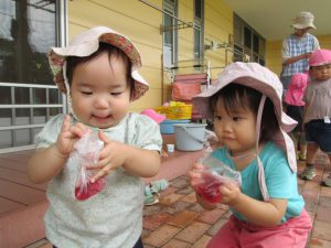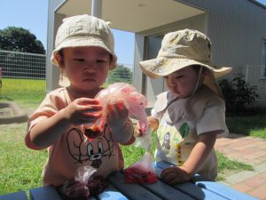 色水遊びから「手のひらでもんで作るという感触」「色水の匂い」「色水の濃淡の違い」等、五感を使って楽しみました。子どもたちは自分の作った色水を誇らしげに「ジュース作ったよ」と言って、宝物のように見せてくれました。遊びの満足感、充実感を味わった子どもたちの表情は輝いていました。今後も遊びに使える花々を育てるところから、子どもたちと一緒に楽しんでいきたいと思います。