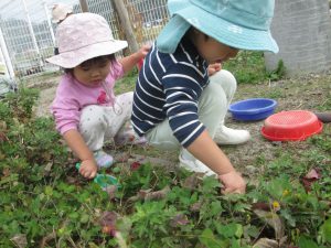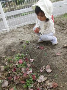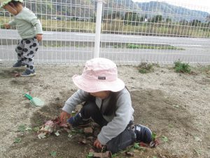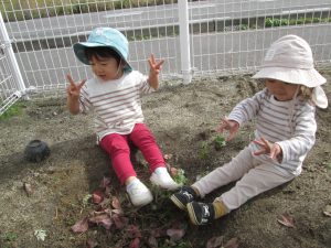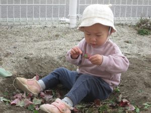いつも見ている光景も、子どもたちの「見て見て」も声で赤い葉っぱが本当に美しいと感じました。紅葉発見から落ち葉集めに展開し、そしてお風呂ごっこへと発展しました。身近なところに秋を感じることができました。今後も継続的に秋の自然を感じたり、触れたりして遊びたいと思います。