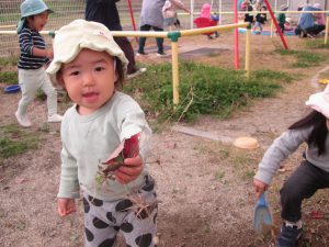 大きい葉っぱを見つけたゆーちゃん。大きさに着目した。