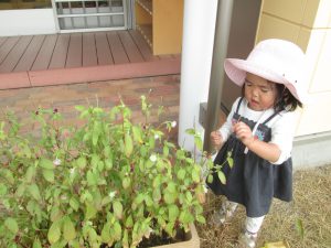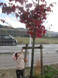 「ねぇ見て見て」と葉っぱが赤くなっていることに気付き、不思議そうに保育士に呼びかけてきた。