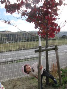 フェンス北側通路の樹々を指さしたゆーちゃん。