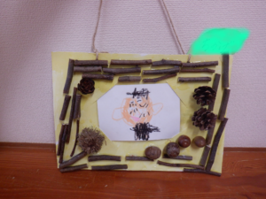 ・散歩に行き、見つけた松ぼっくりやどんぐりを使って、秋のフォトフレームを作りました。