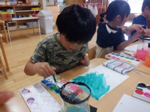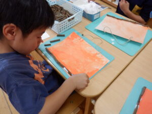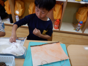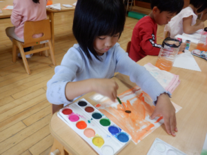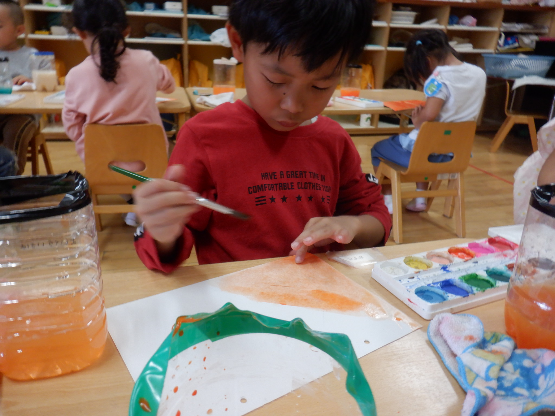 ・まずは台紙作り。秋の色は何色があるか子どもたちと考え、自分の中の秋の色をイメージしながら塗りました。