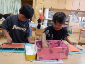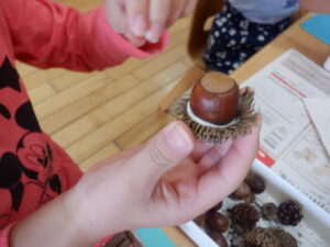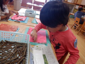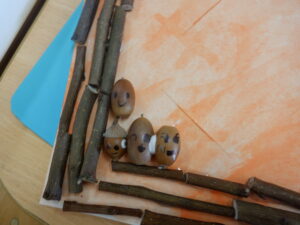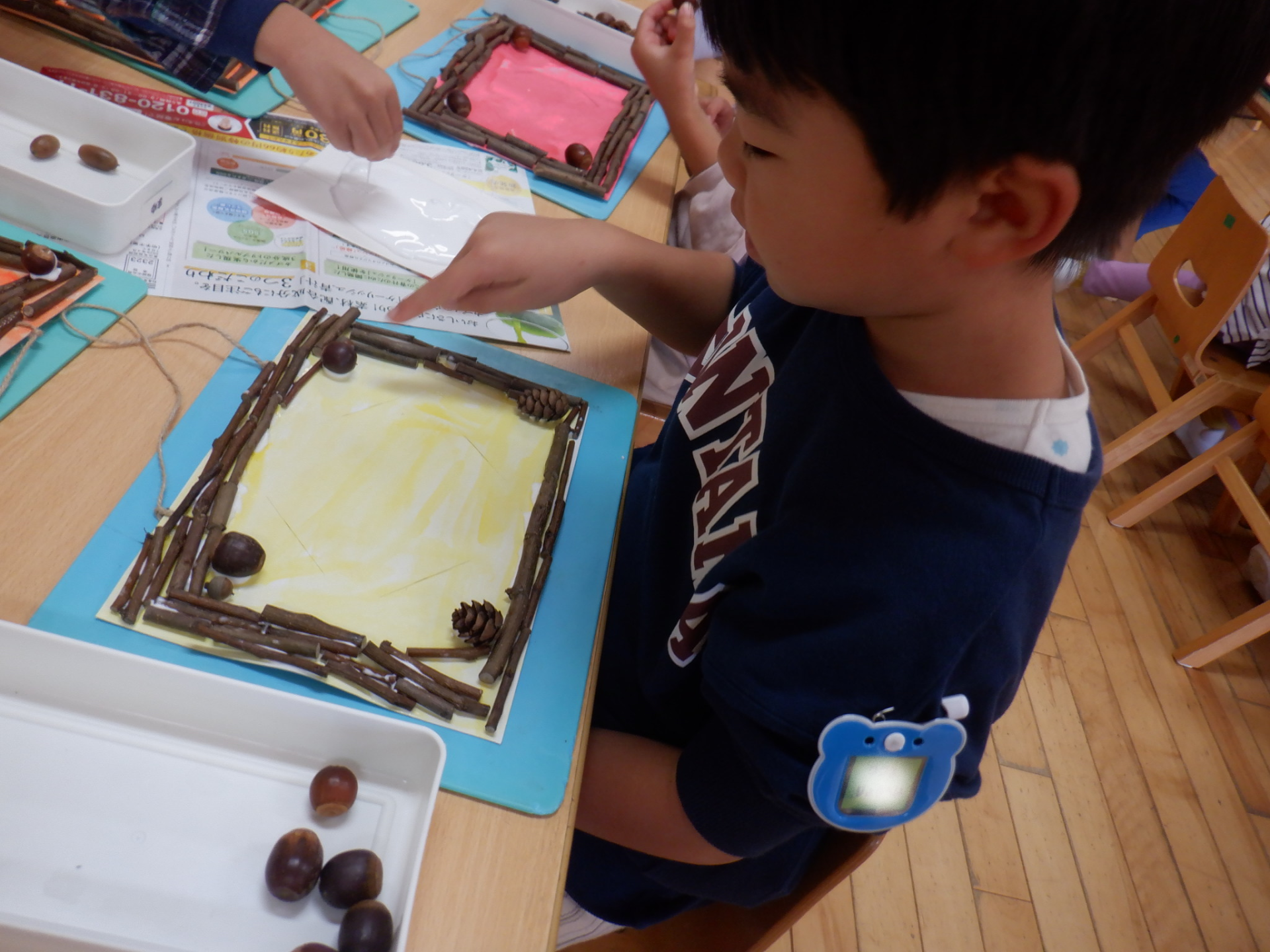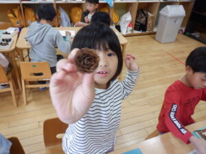 ・自分たちで集めたどんぐりや松ぼっくりを使って作ったことで、より作品に愛着を持って作る姿が見られ、自然物により親しみを持つことができました。