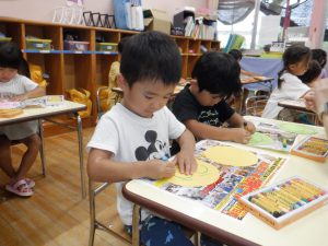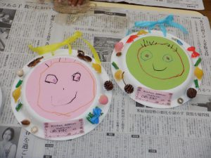 お散歩で拾ってきておいた自然物と色つきのマカロニを顔の絵を貼った紙皿に飾り付けていきます。「どこにつけようかな?」「これはここにしよう・・・」相談しながらどんどん飾っていきます。