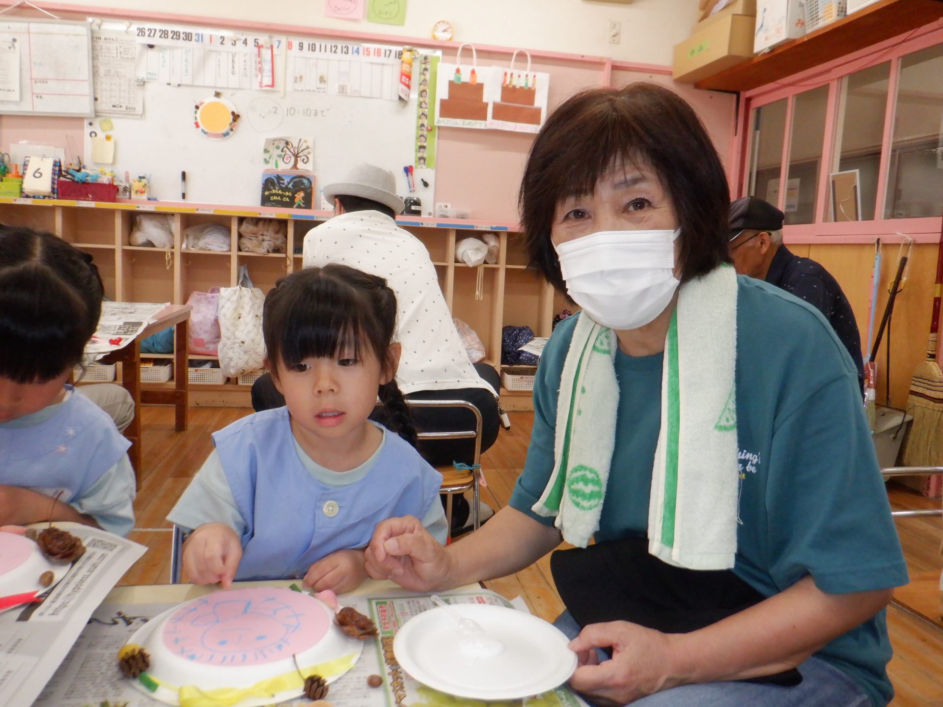 ひと遊びした後は、秋の自然物を使って一緒に素敵なプレゼントを作りました。