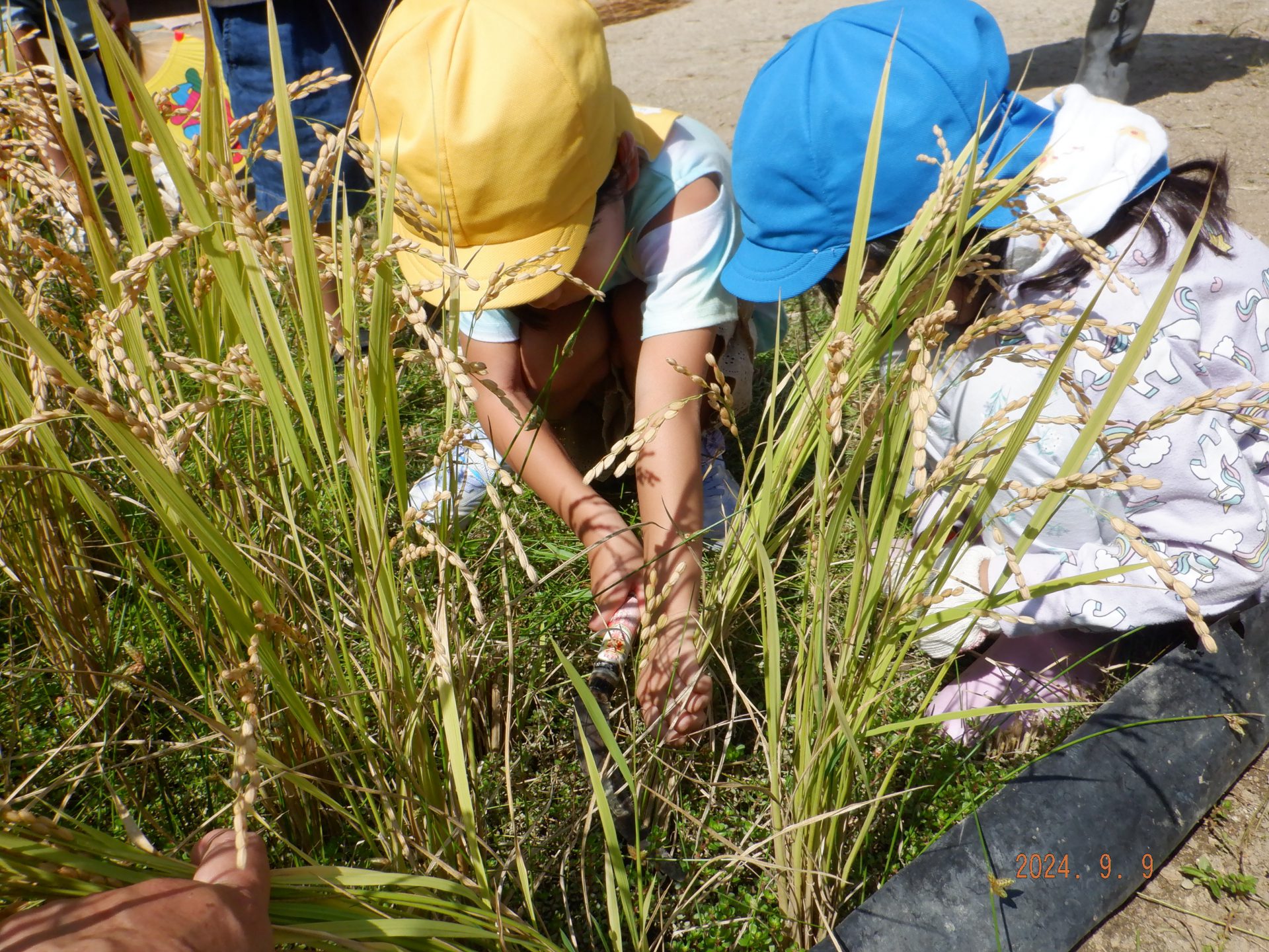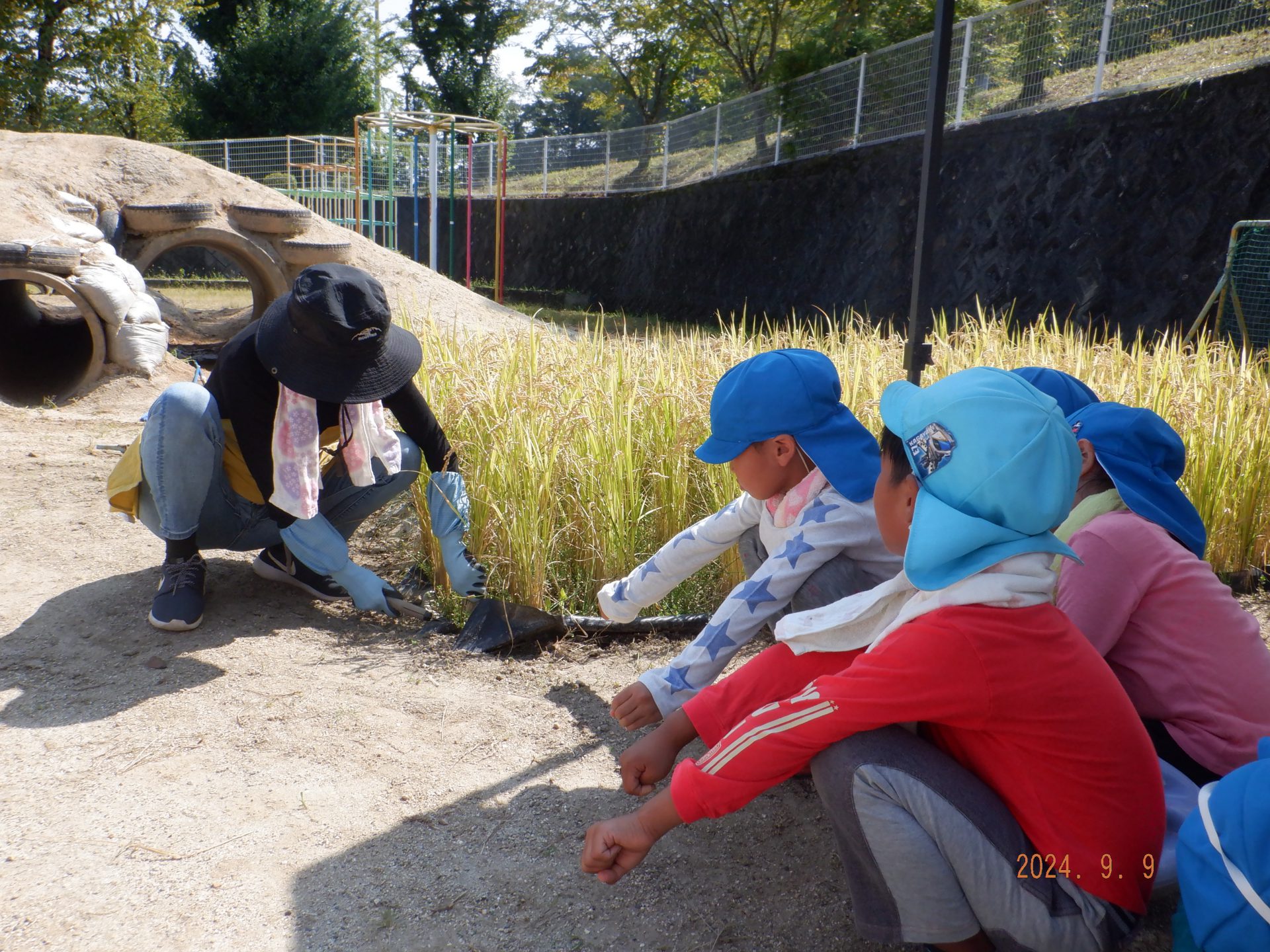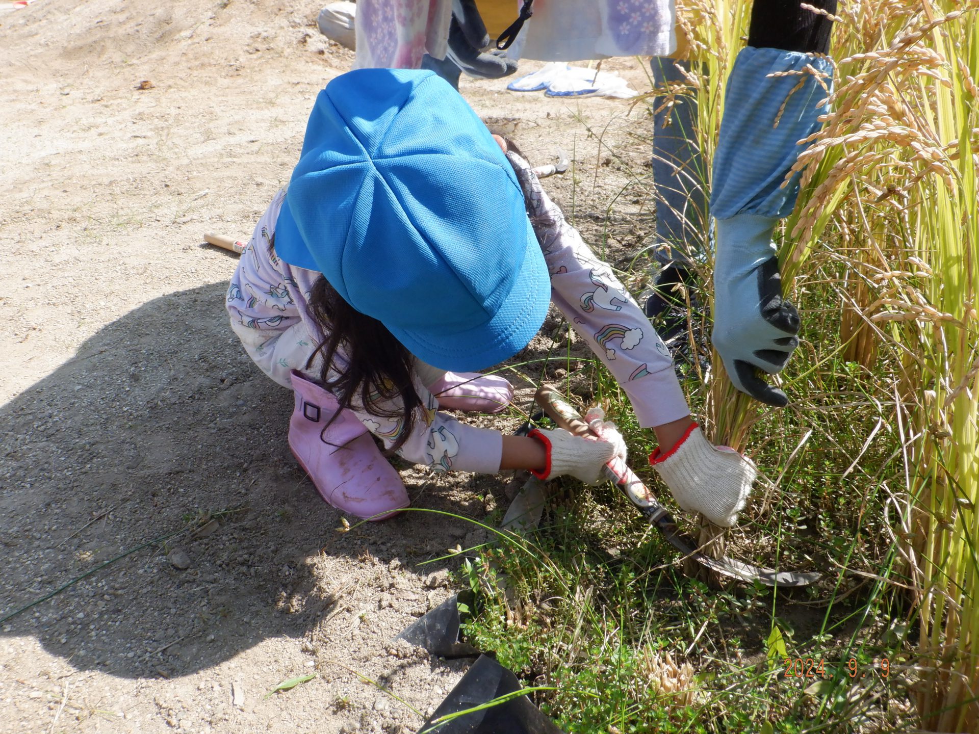 園庭にある田んぼの稲も収穫に時期を迎え、「お米ができている!!」とうれしそうな子どもたちの声。米作りでお世話になっている久保田さんに教えてもらいながら稲刈りをしました。