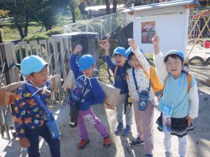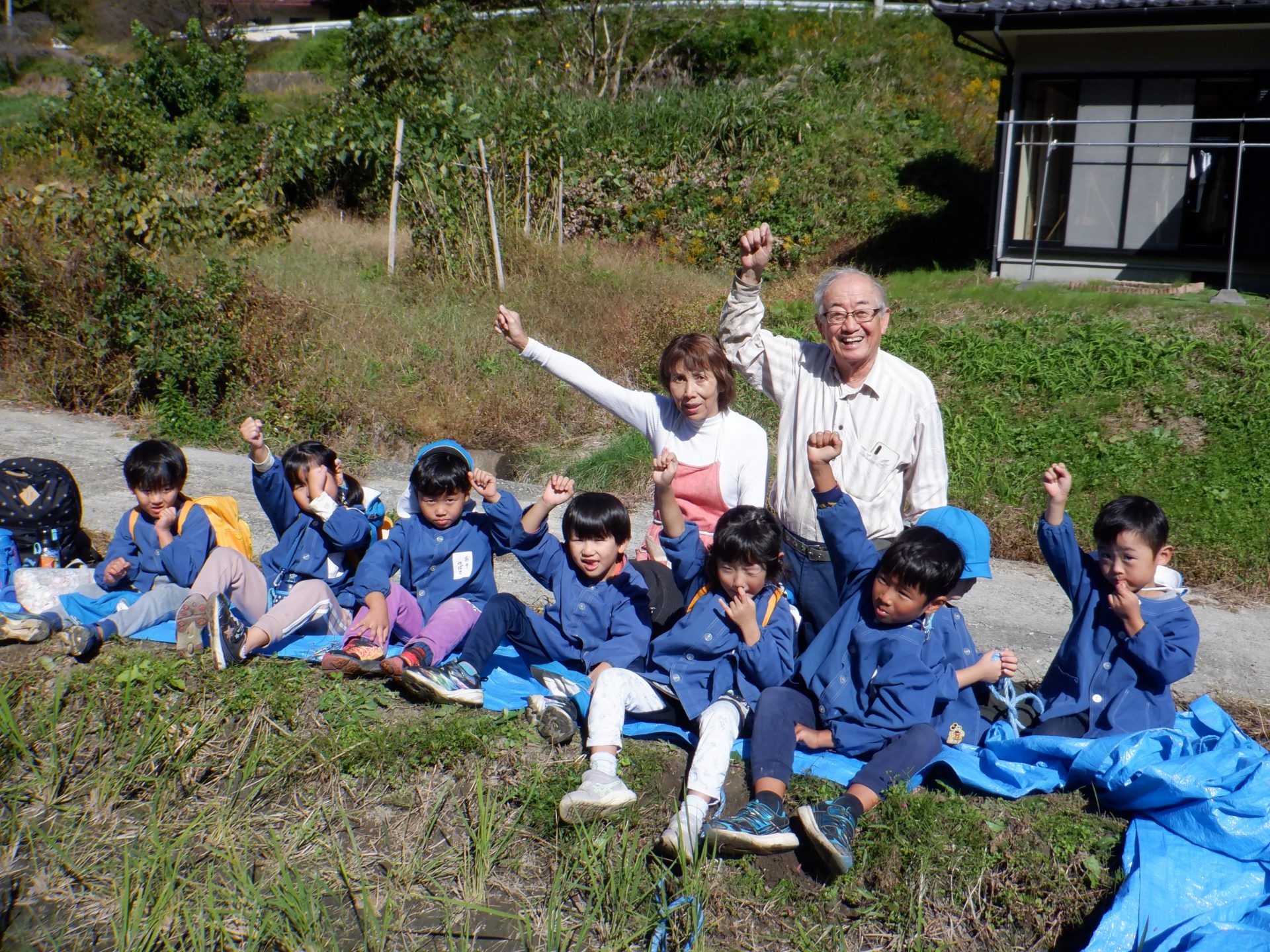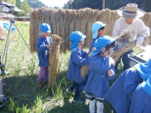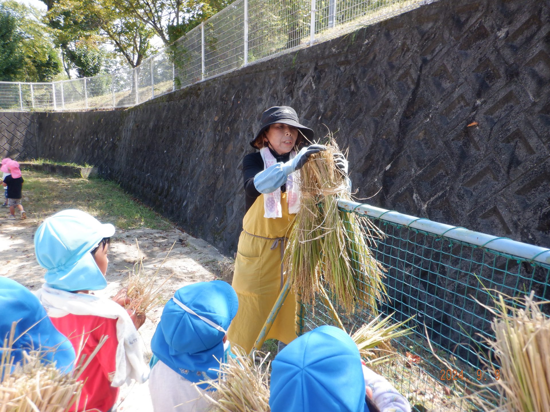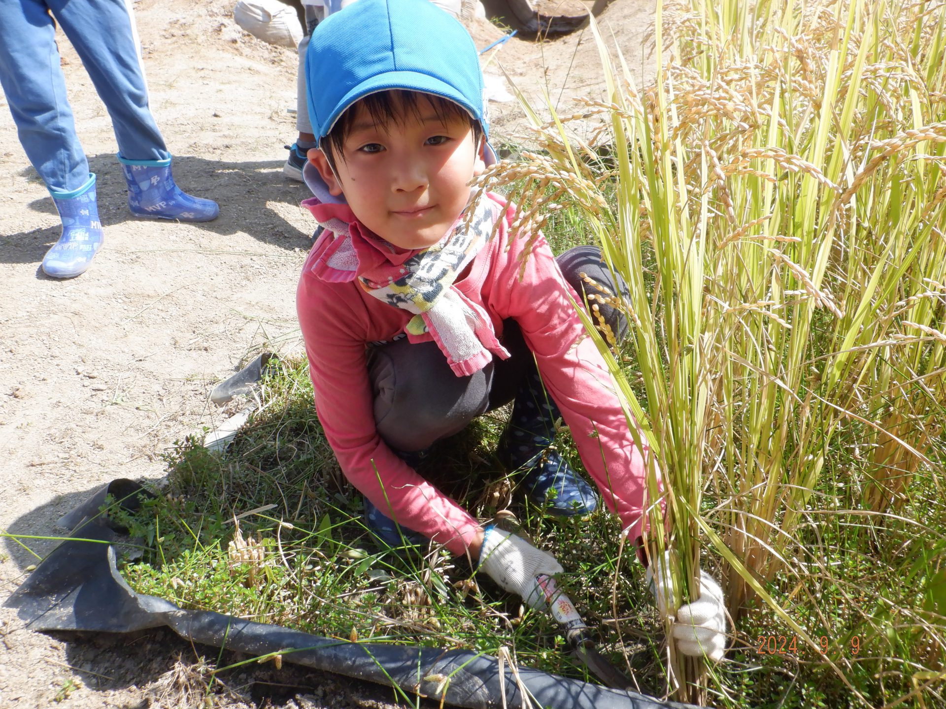 園庭にある田んぼの稲も収穫に時期を迎え、「お米ができている!!」とうれしそうな子どもたちの声。米作りでお世話になっている久保田さんに教えてもらいながら稲刈りをしました。