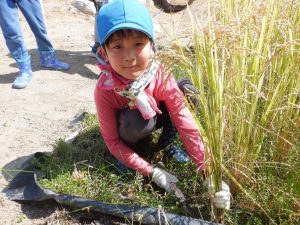 「稲の持ち方、鎌の持ち方はこいうだよ。」と教えてもらい、一人ひとり刈っていきました。
