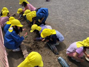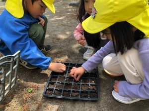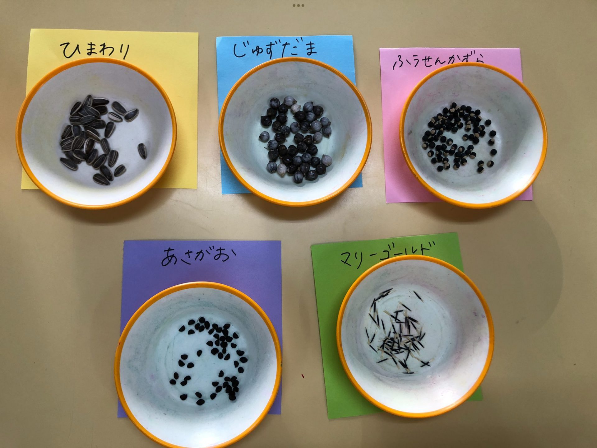 摘んで遊べる草花、種がたくさん採れる草花が園庭にたくさんあったらいいなぁ、という思いもあり、春に子どもたちと一緒にいろんな種を蒔きました。