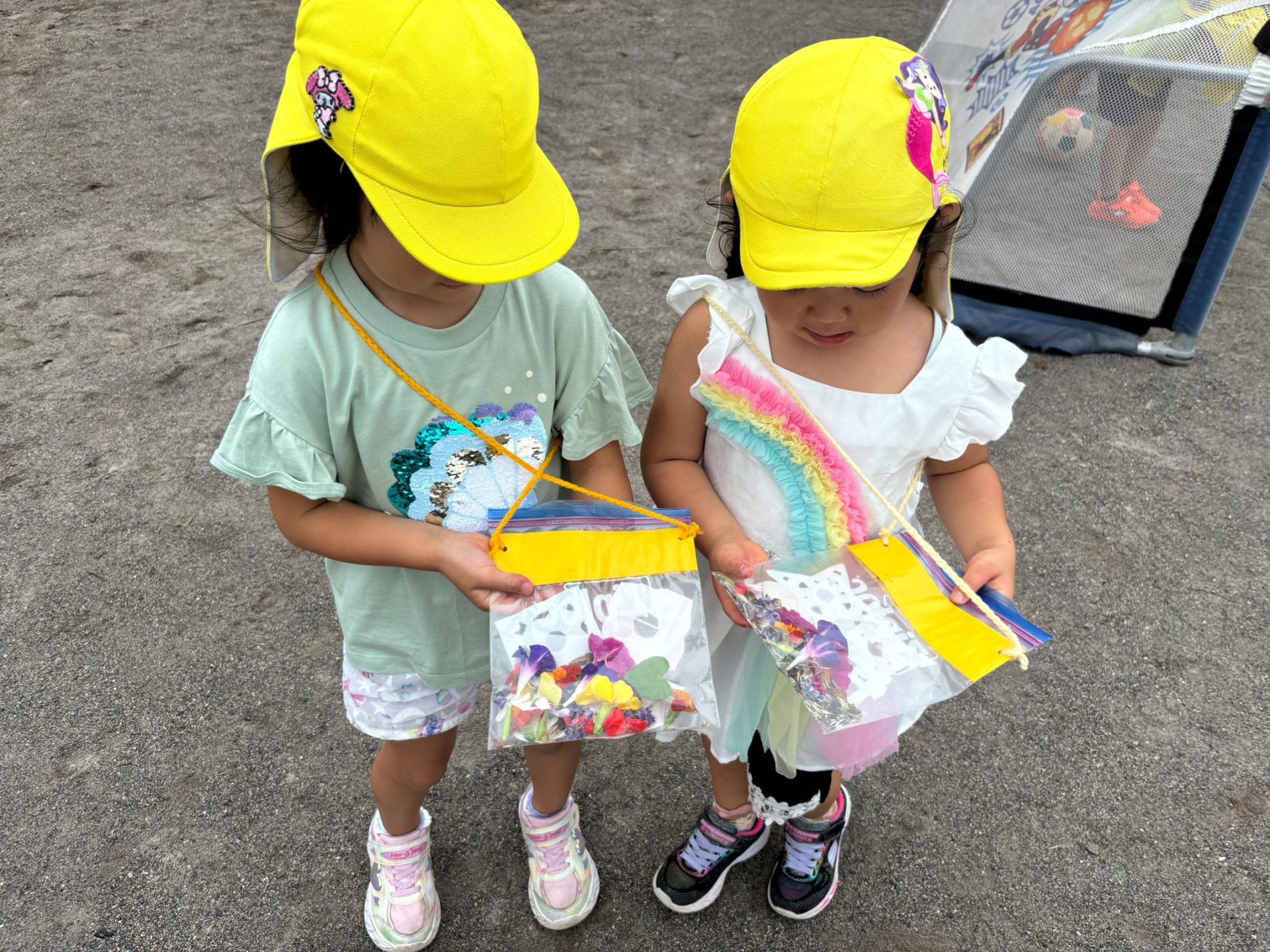 ・集めたお花を使って遊び、その場限りになってしまうこともありましたが、見立て遊びなどそれぞれが満足できる遊びができていたのではないかと思います。
