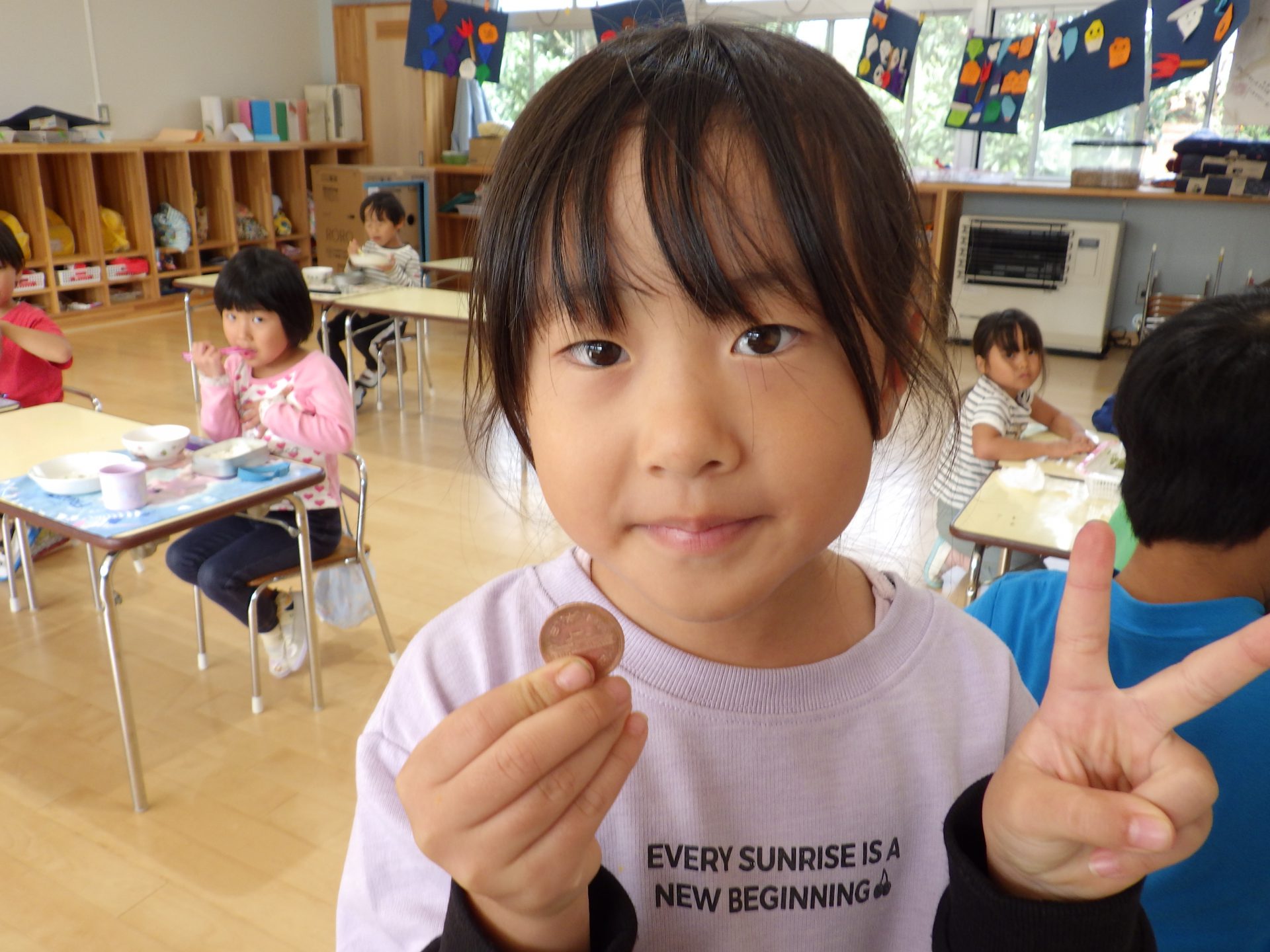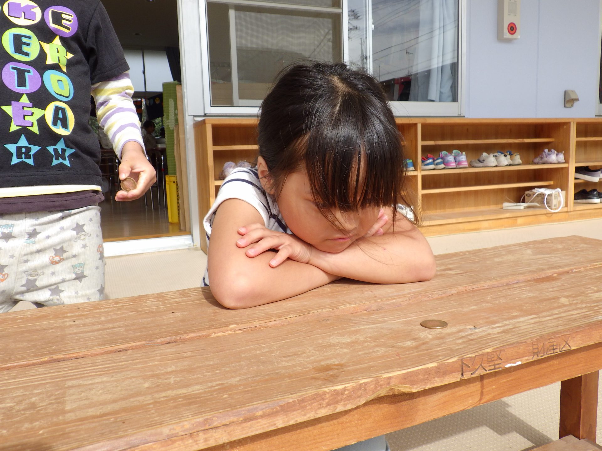 散歩先で見つけたカタバミという葉っぱで10円玉を磨くとピカピカになることを知った年長さん