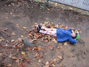 「沢山集めたよ!」ごろんと寝転がって葉っぱのお布団の完成です!