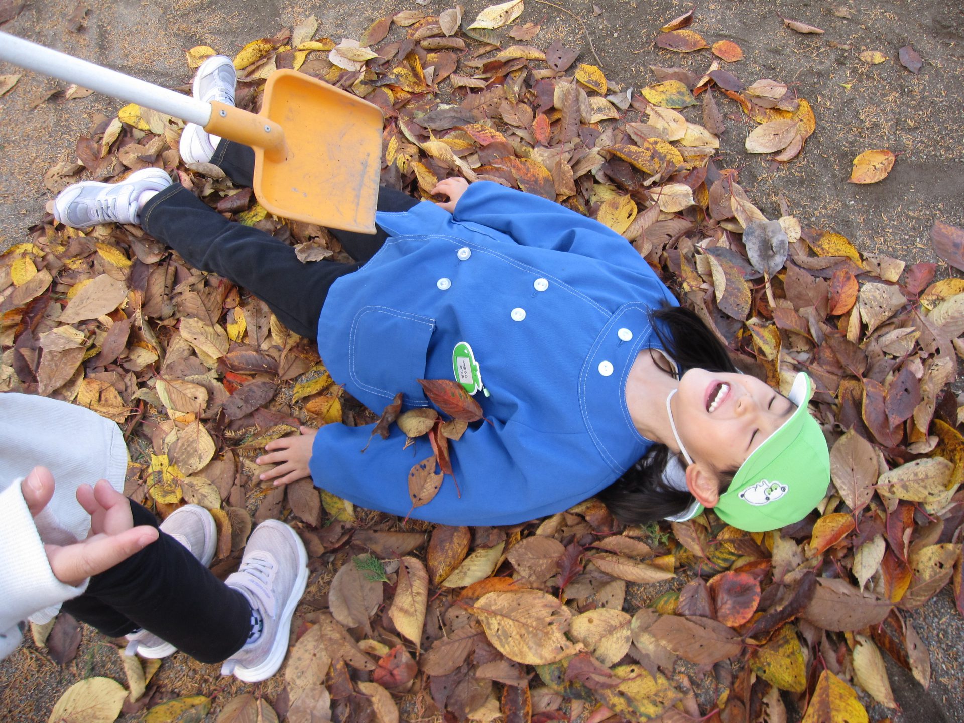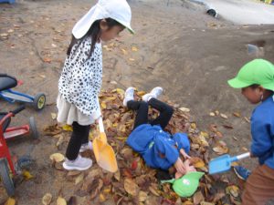 落ち葉掃除をしていたら、「先生手伝うよ~」とスコップを持って年長児が登場✨