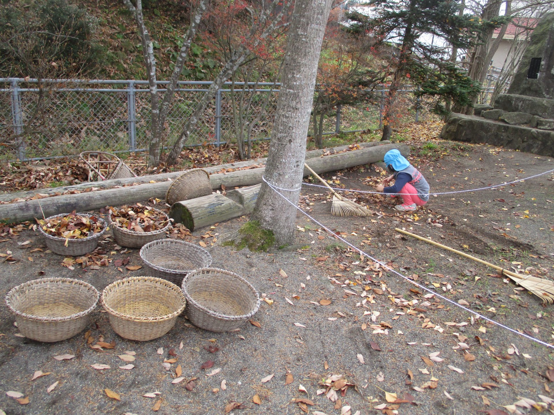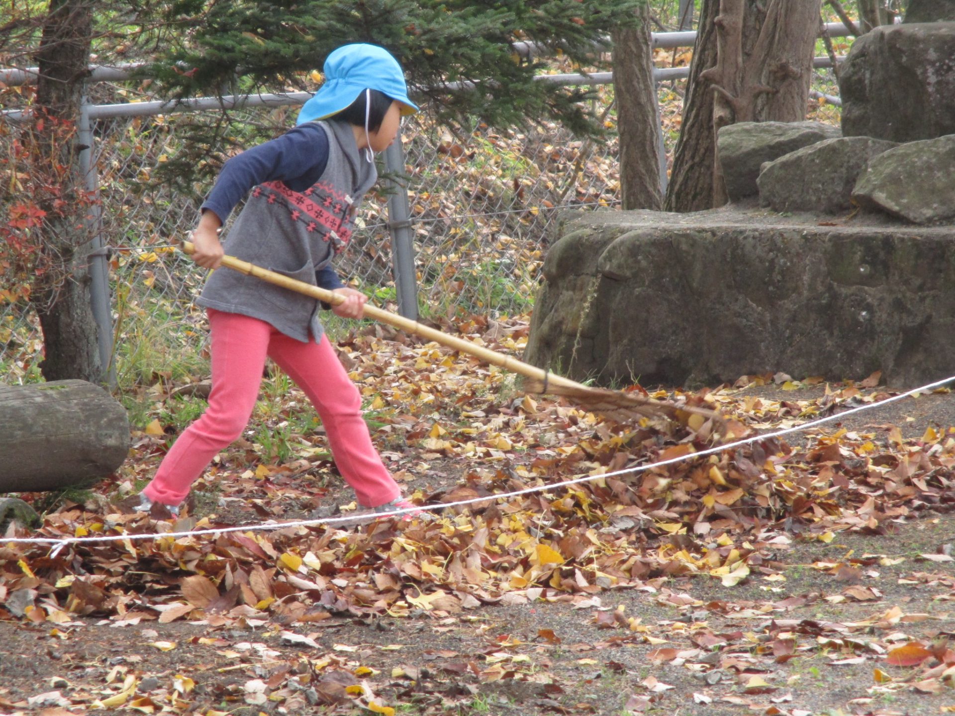 先日の台風の影響もあり、園庭のさくら、いちょう、もみじなどの落葉樹の葉がきれいに落ちてしまいました。虫取り網を片付けて熊手を出しておこう、と下駄箱近くのコーナーに熊手 をだすと、早速「これ使っていいの?」と年長児。どうぞと言うと去年の経験から上手に使いこなし、落ち葉を集めます。