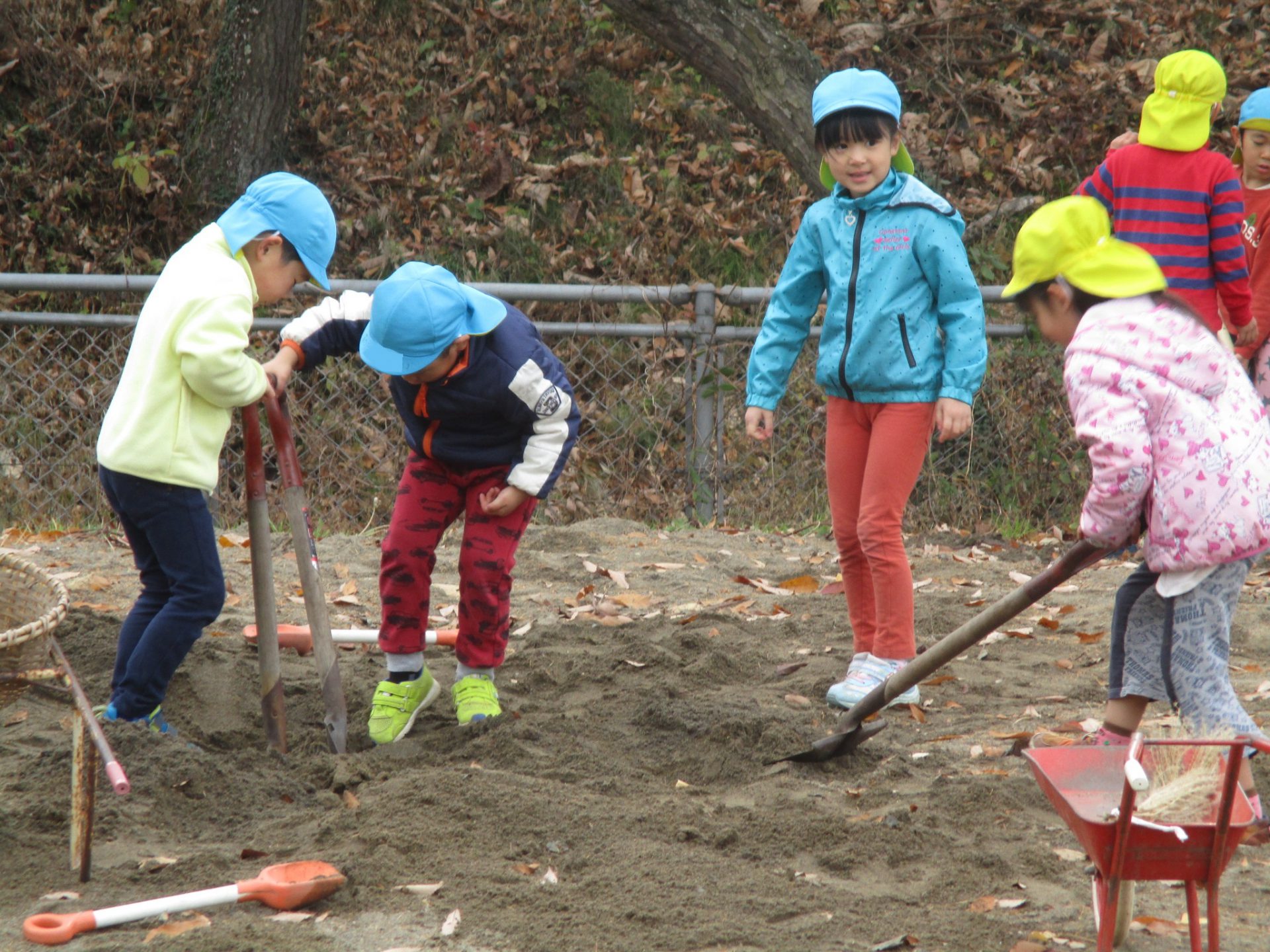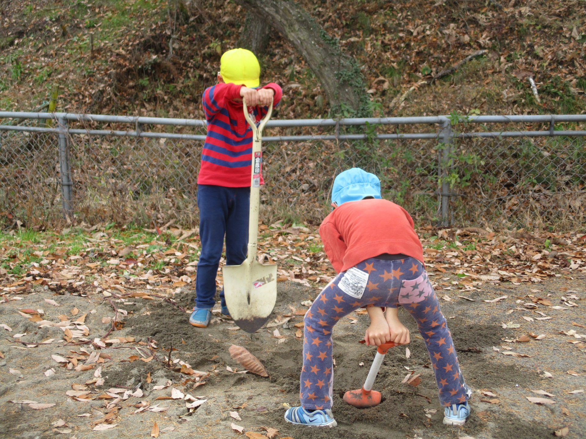 「あっちよりも大きくしよう!」「こっちは深くするもんね!」とお互いを意識しながら掘ります。さつまいもほりで使った大きいシャベルを、年長さんだけという約束で出すと、「腰が痛いー!」と言いながらどんどん掘っていきました。