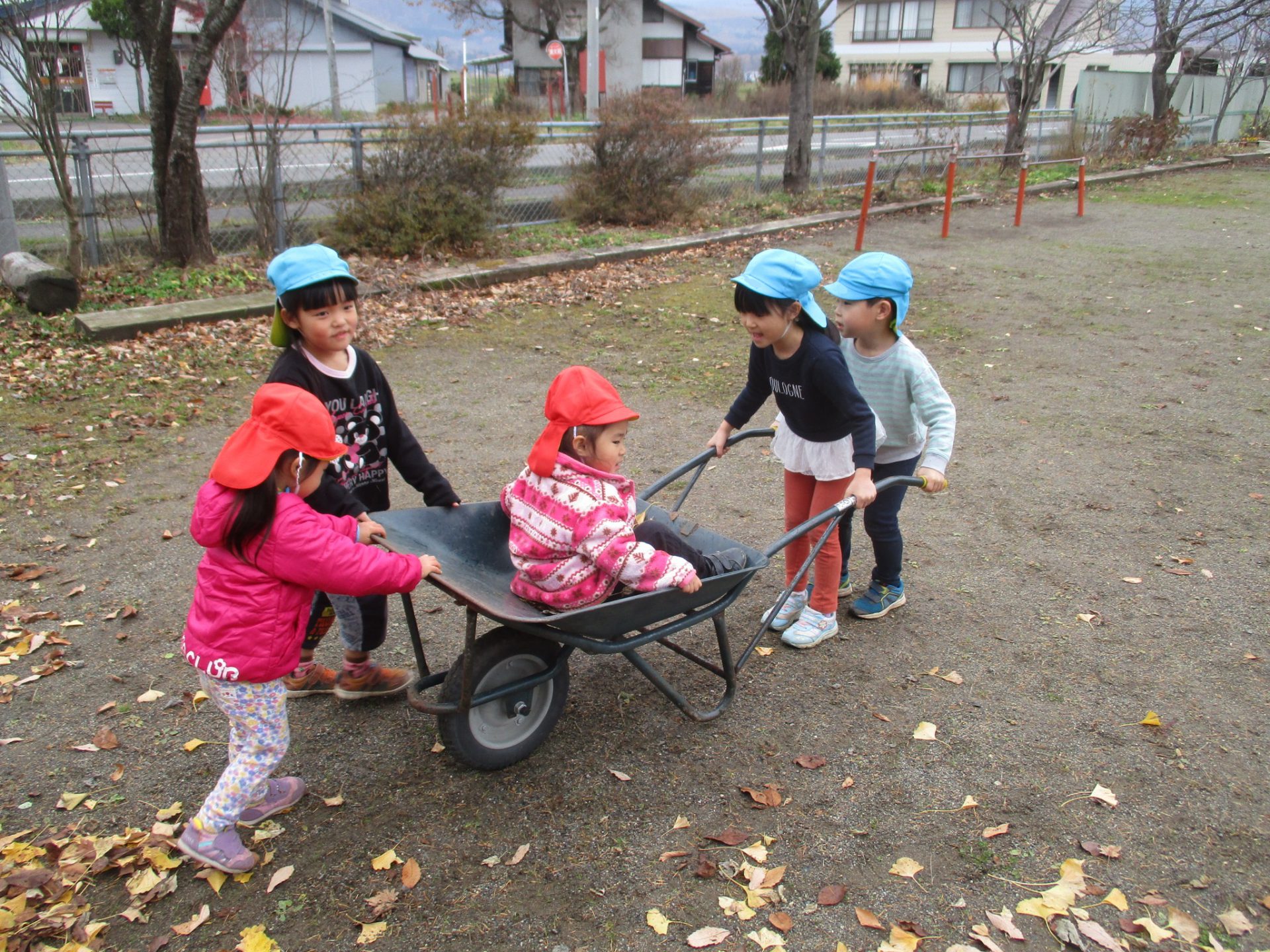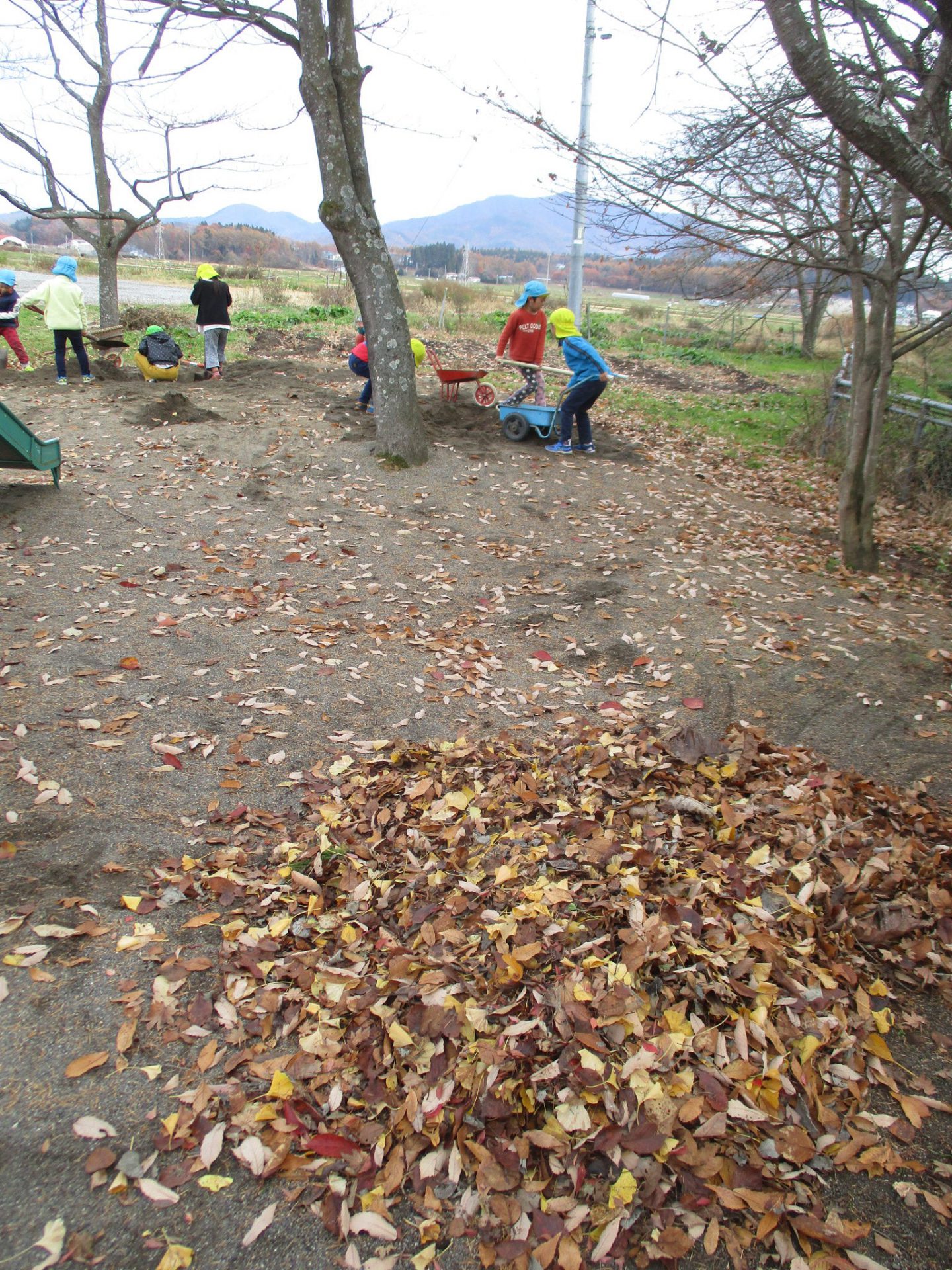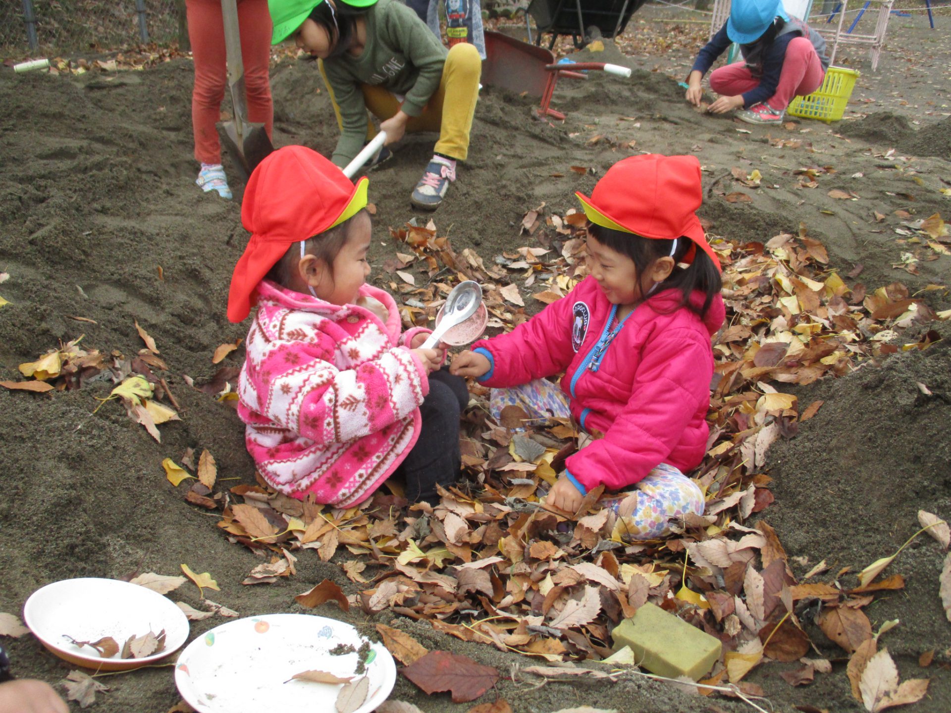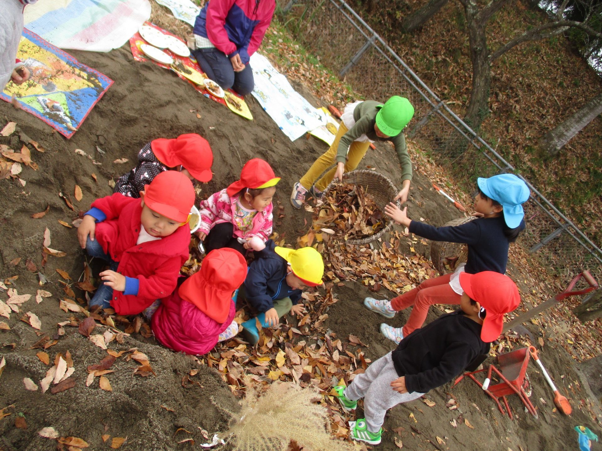 最初は対立していたふたつのグループが合体し、そこへさくらんぼさんも遊びにきてさらに遊びが広がっていきました。落ち葉を熊手で集める作業そのものが楽しくて道具の使い方を身に付けたり、対立するグループ同士の話し合いで相手の気持ちに気付いたり、年下の子と触れ合うことで気持ちに寄り添ったり優しい気持ちになれたり、単純な遊びの中でいろいろな学びがあったなと思います。まだまだ秋の自然で楽しめそうです。寒さに負けずどんどん外へ出ていろいろな経験を増やしていきたいと思います。
