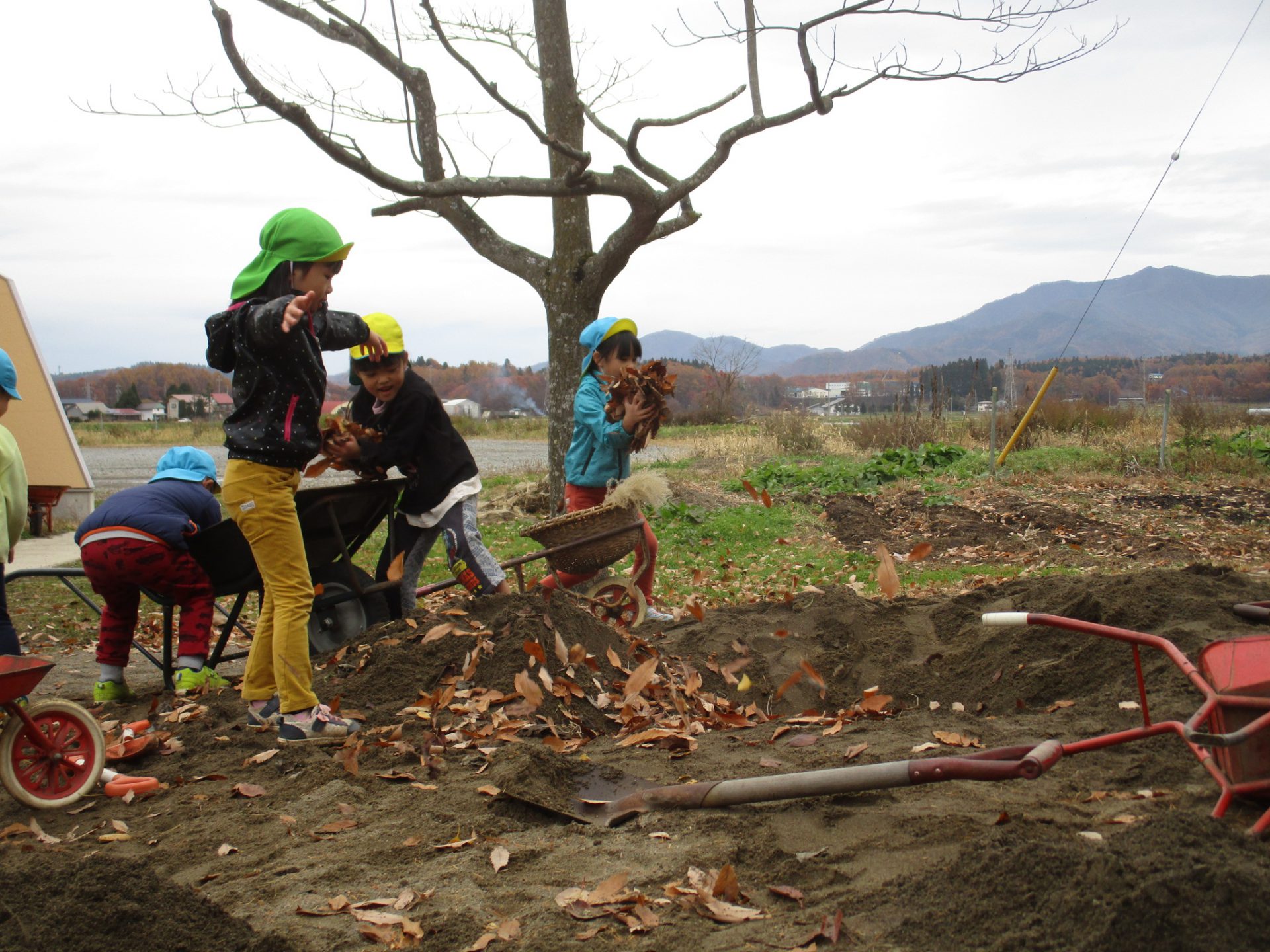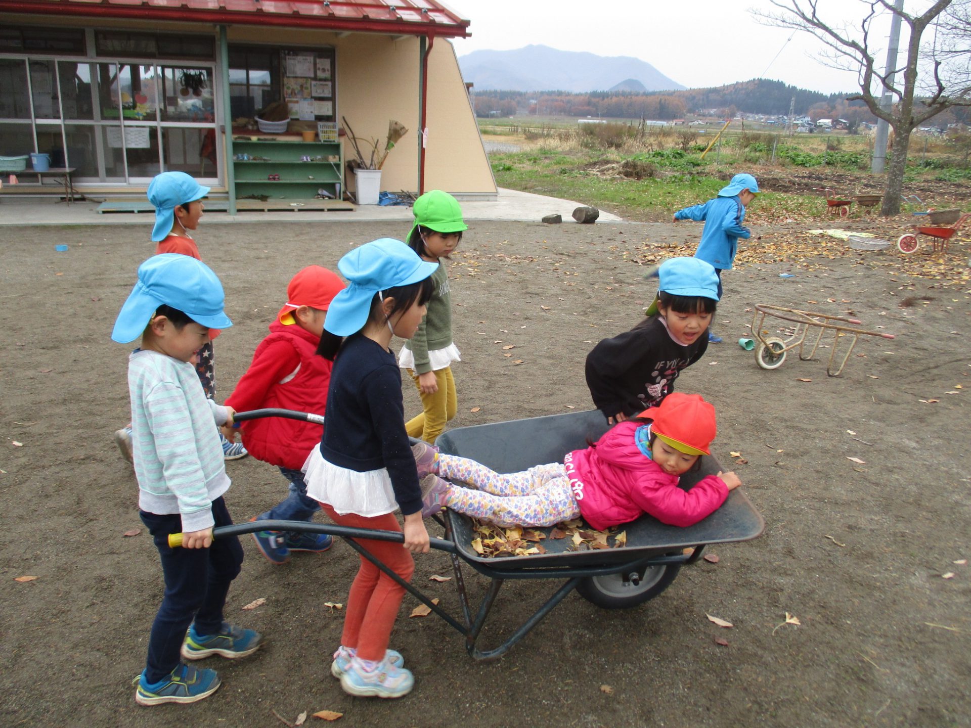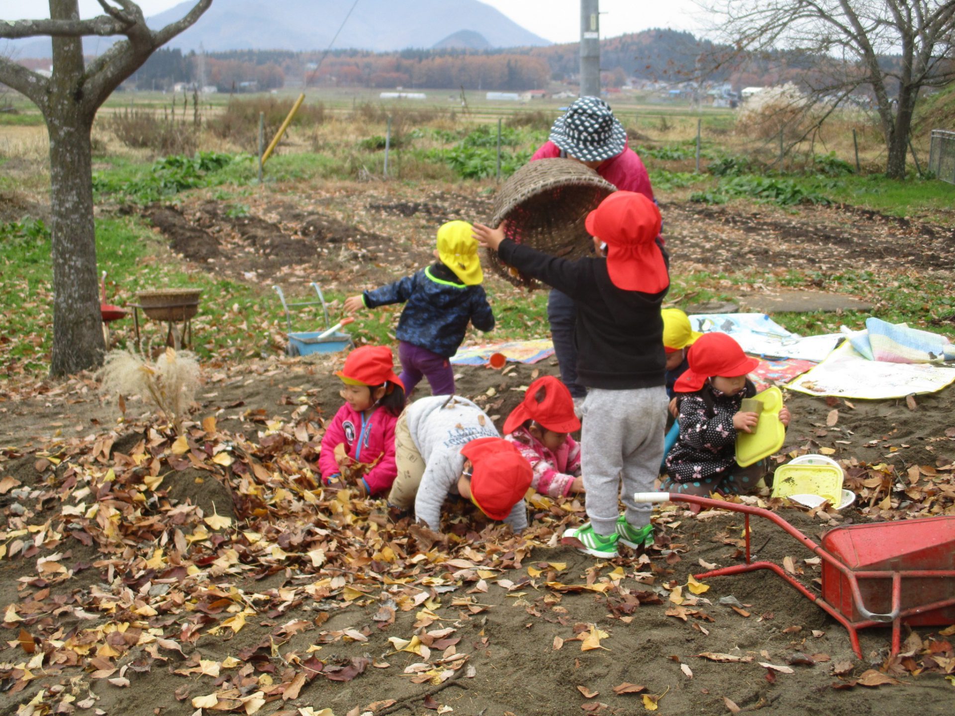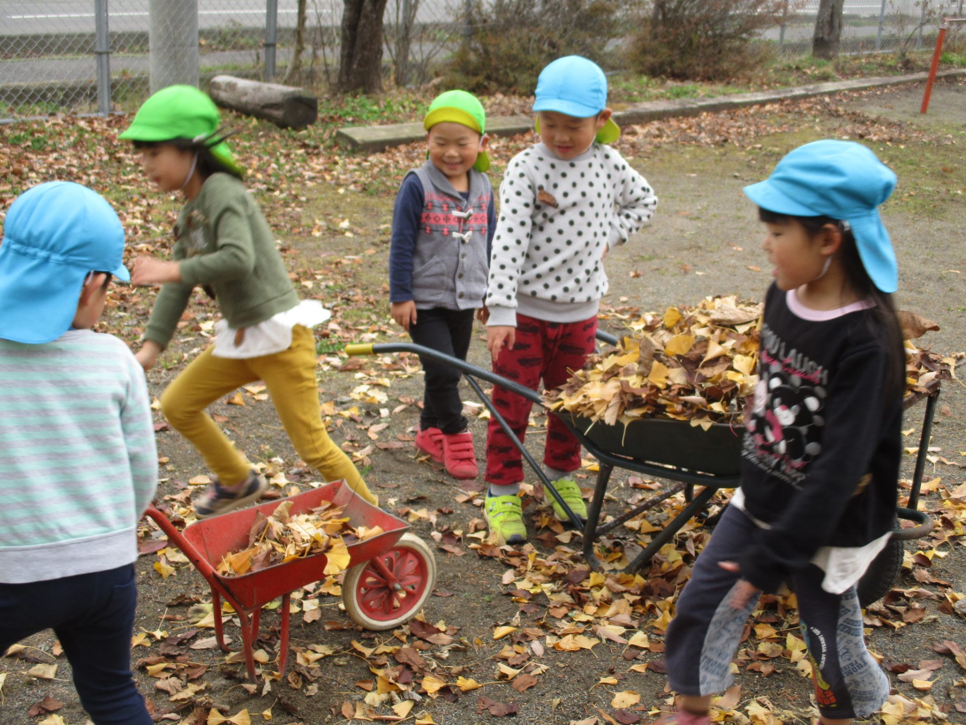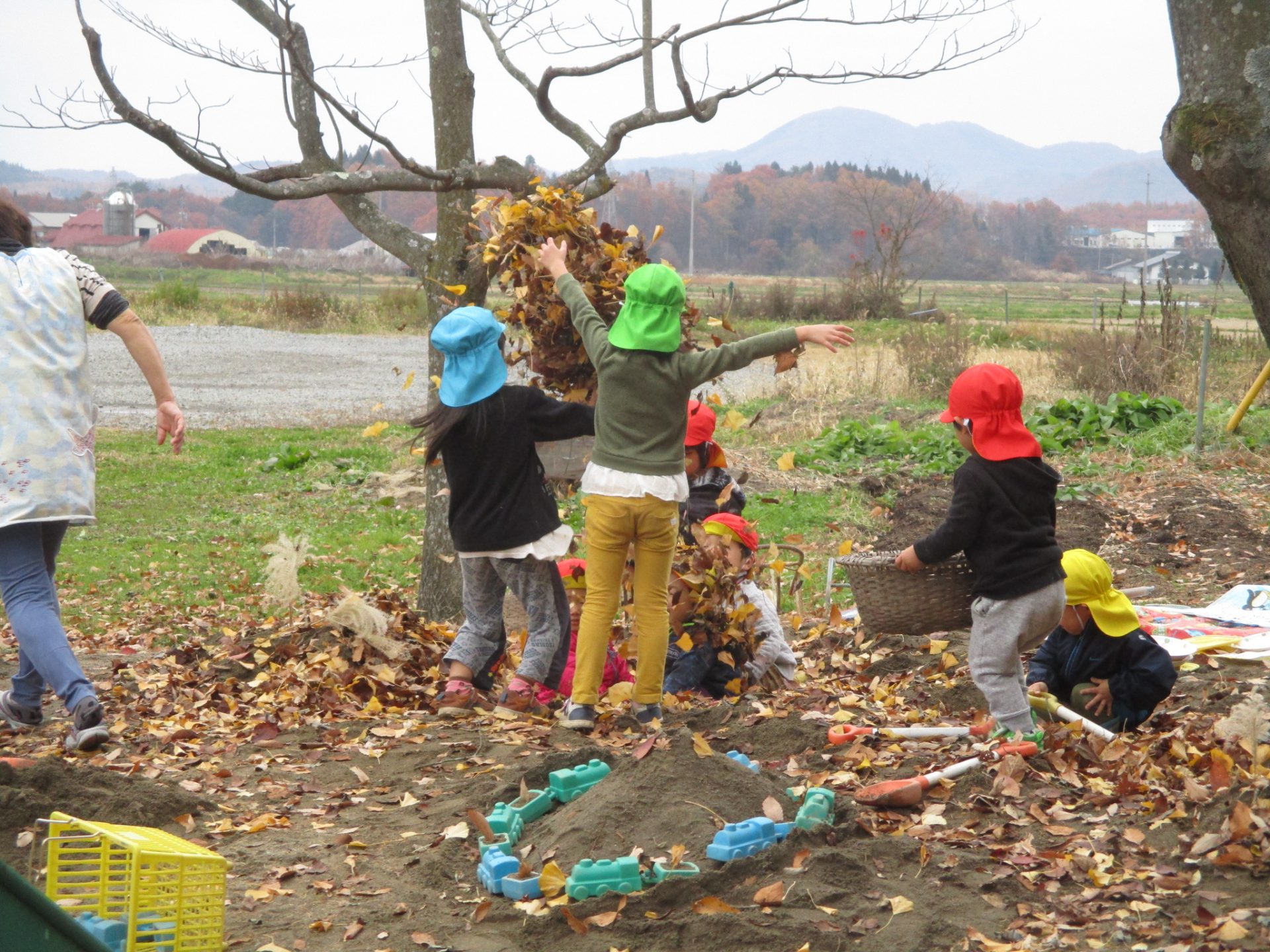 最初は対立していたふたつのグループが合体し、そこへさくらんぼさんも遊びにきてさらに遊びが広がっていきました。落ち葉を熊手で集める作業そのものが楽しくて道具の使い方を身に付けたり、対立するグループ同士の話し合いで相手の気持ちに気付いたり、年下の子と触れ合うことで気持ちに寄り添ったり優しい気持ちになれたり、単純な遊びの中でいろいろな学びがあったなと思います。まだまだ秋の自然で楽しめそうです。寒さに負けずどんどん外へ出ていろいろな経験を増やしていきたいと思います。