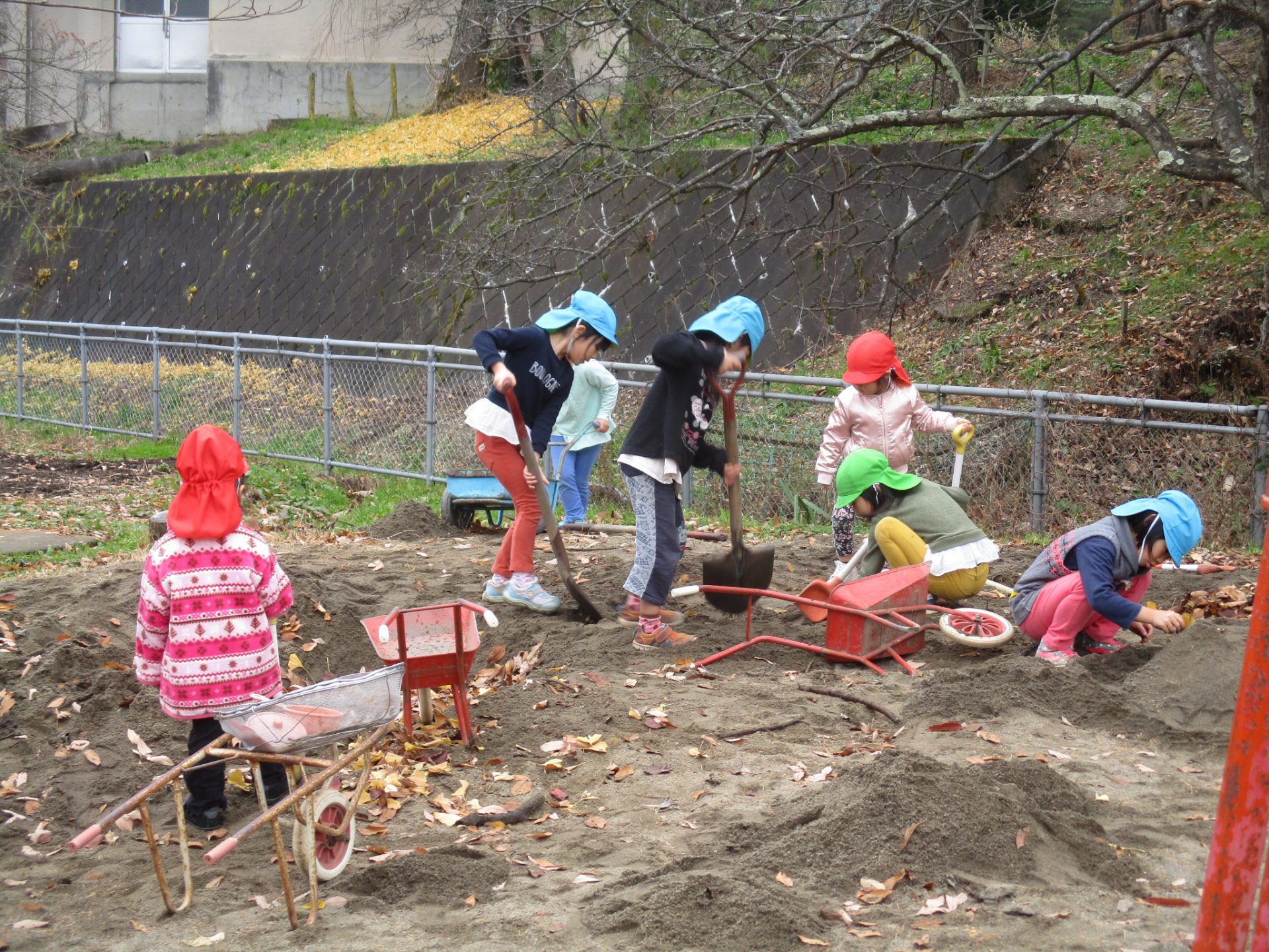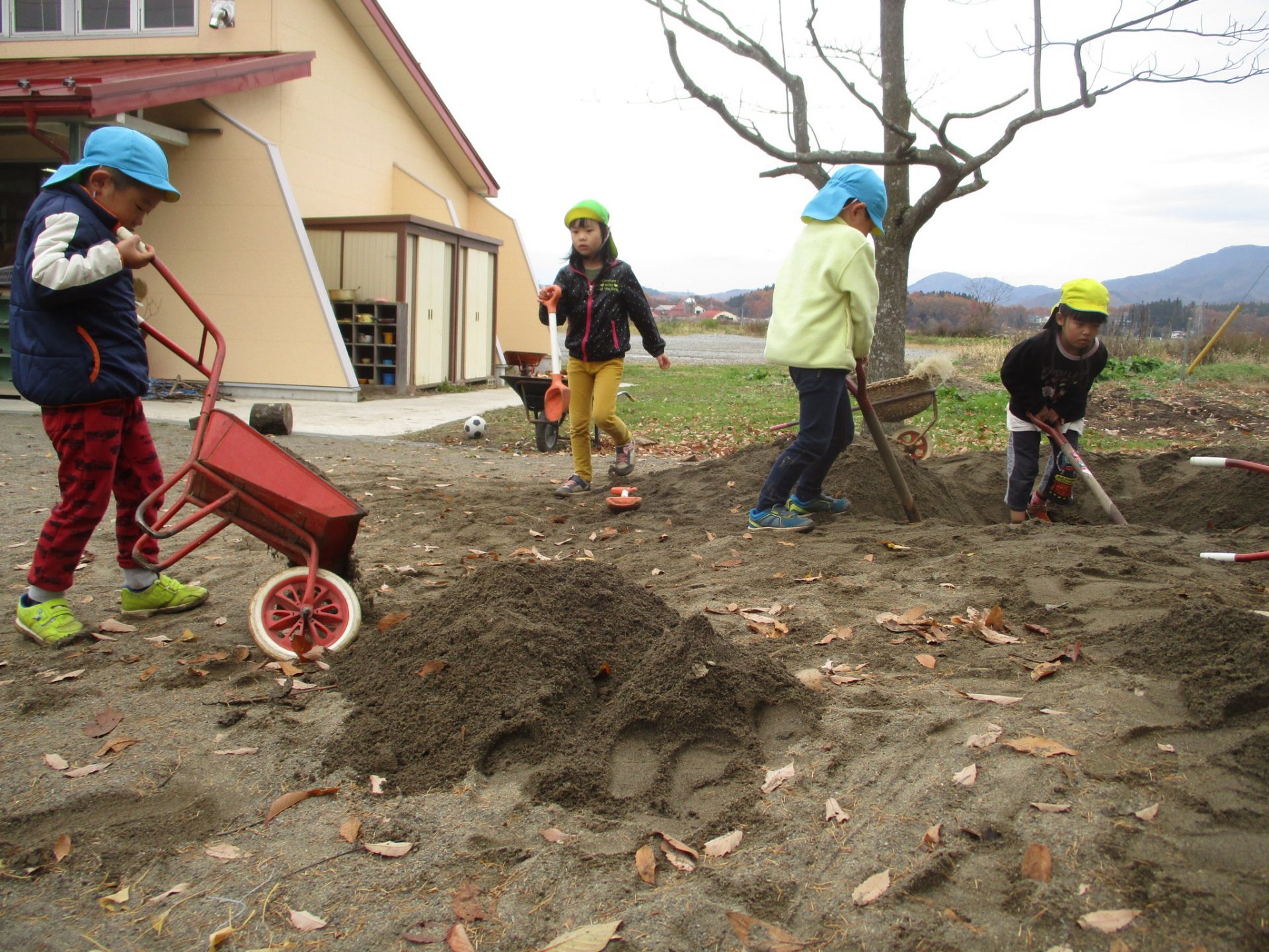 「ぼく、ここ掘るね!」「私土を乗せるね!」「じゃあぼくは運ぶね!」声を掛け合って自然に作業が進んで行きます。ここを手伝えばうまく進むな、と一人ひとりが考えて気付いているからこそです。