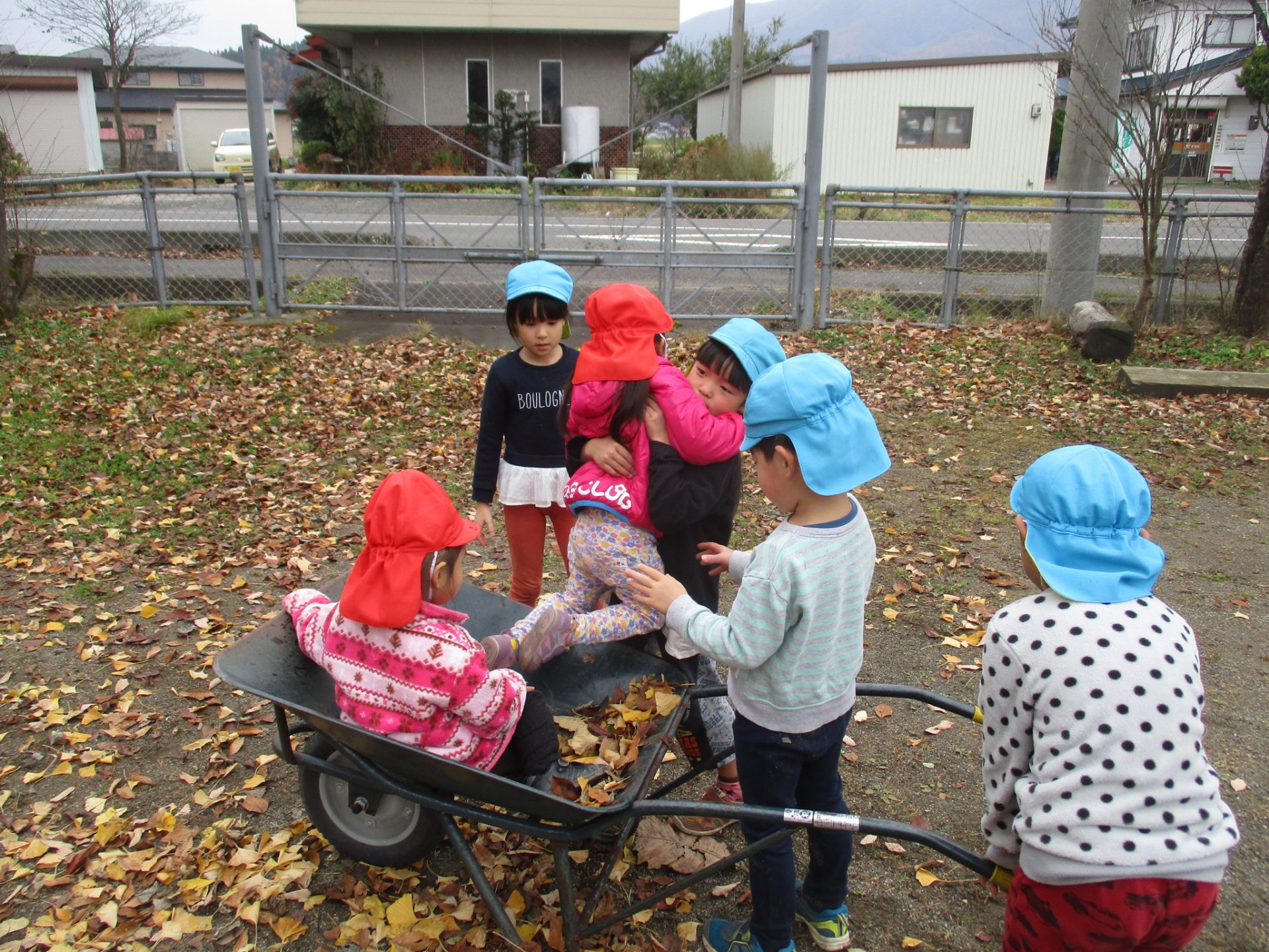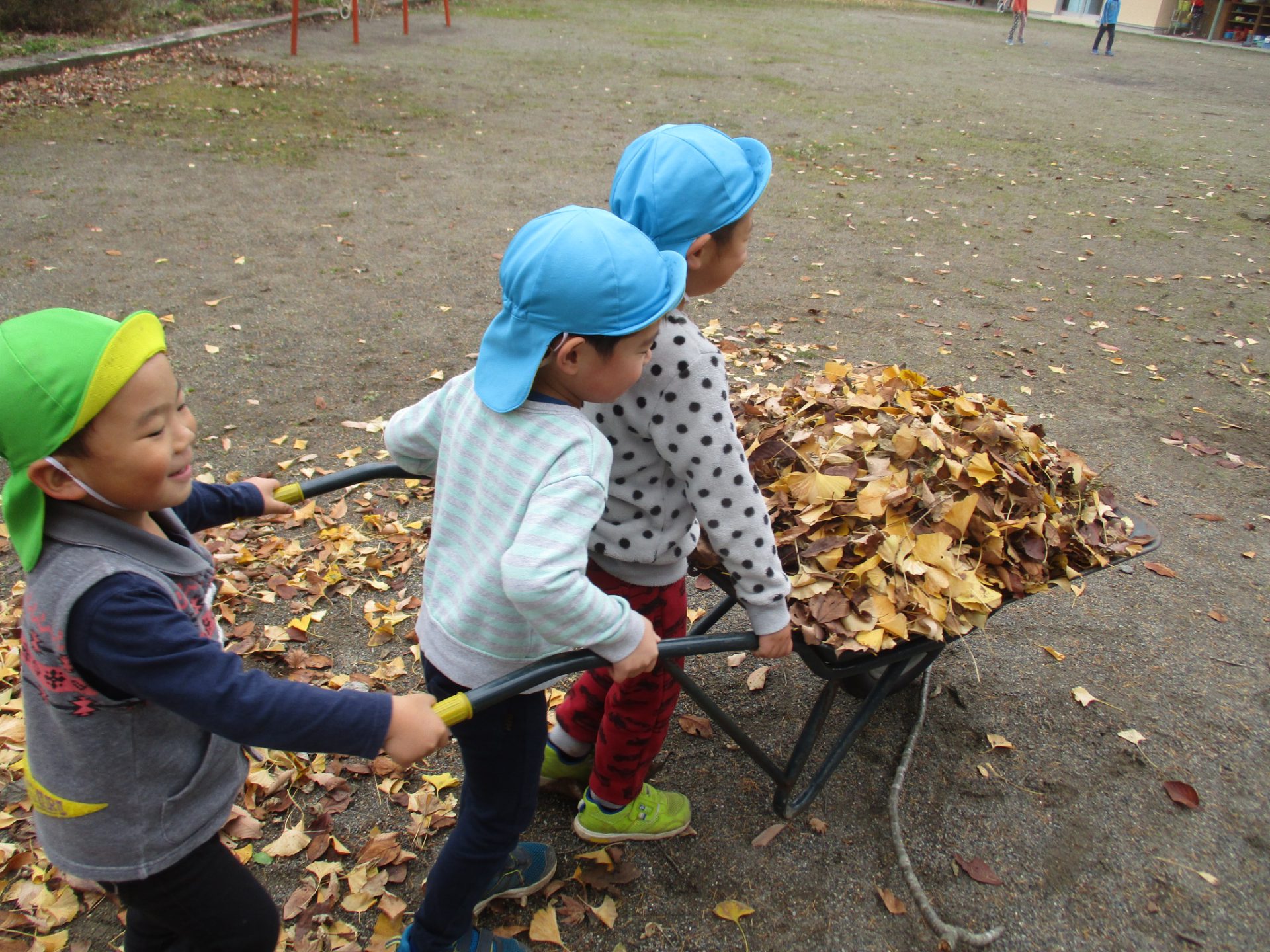 「やるやる!」「これなら一気に運べるね!」とさらにはりきって落ち葉運びです。