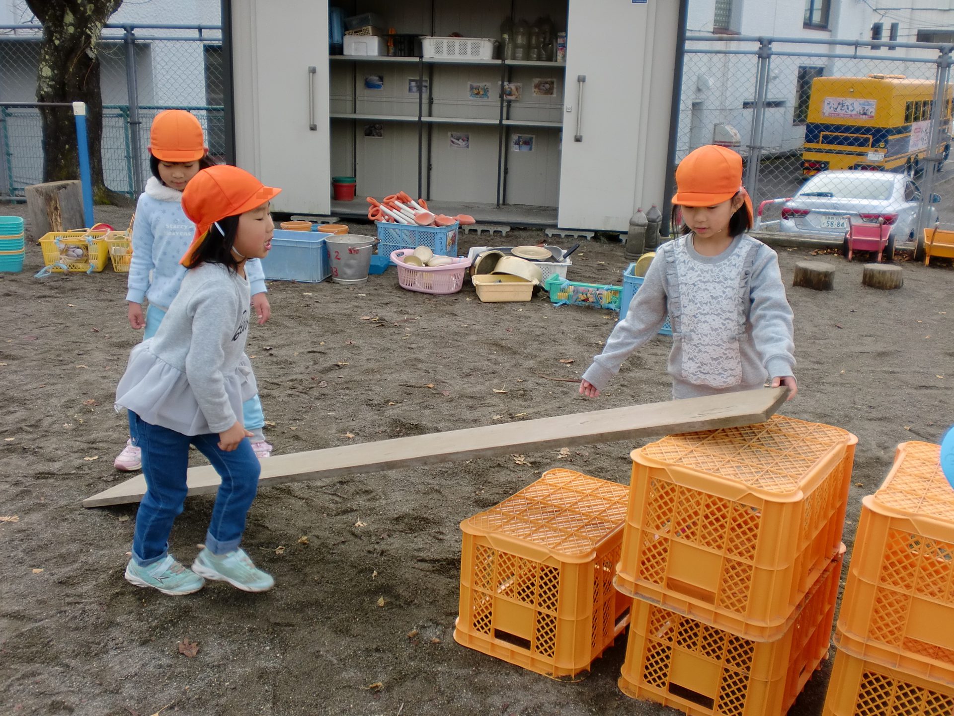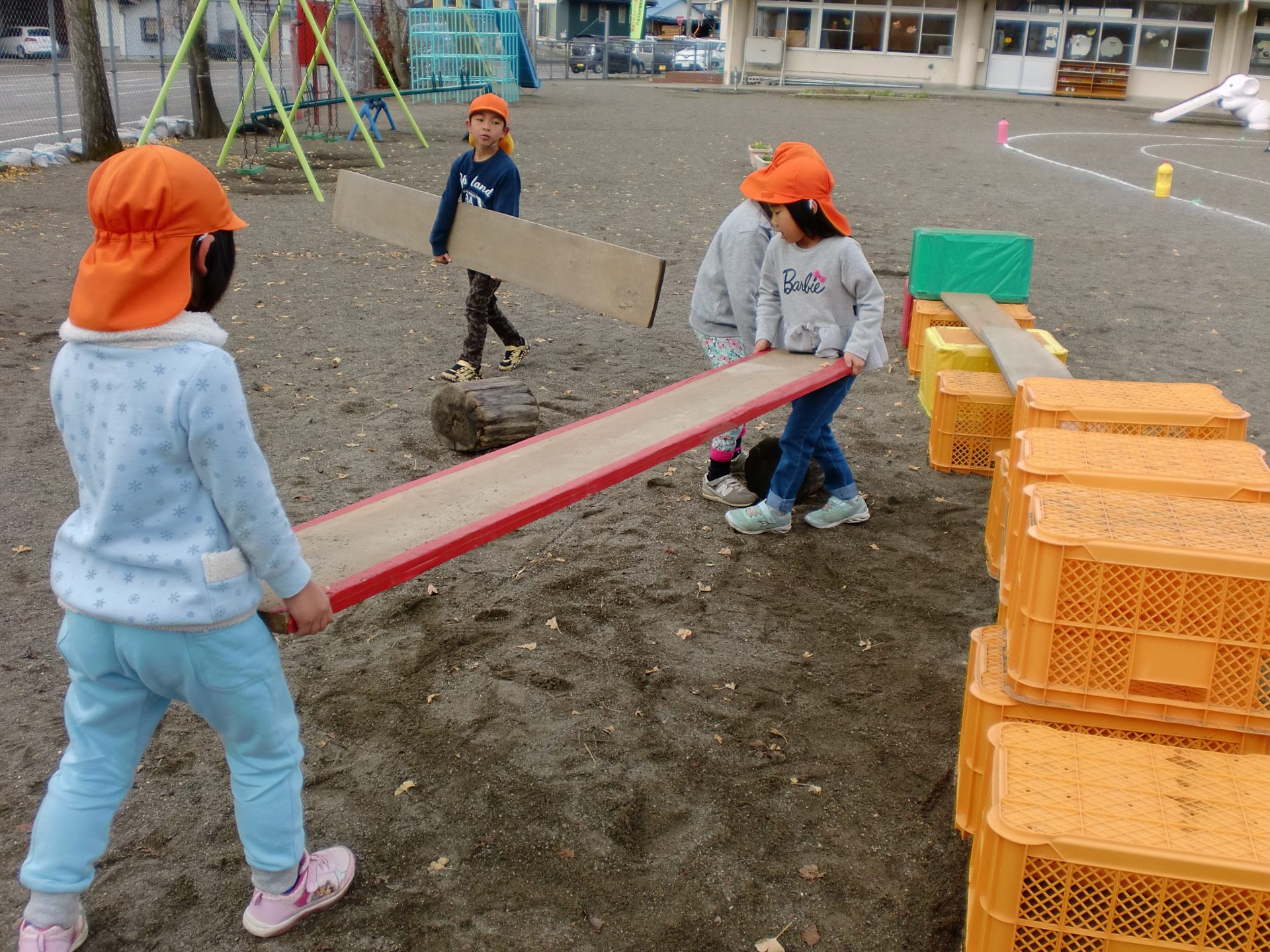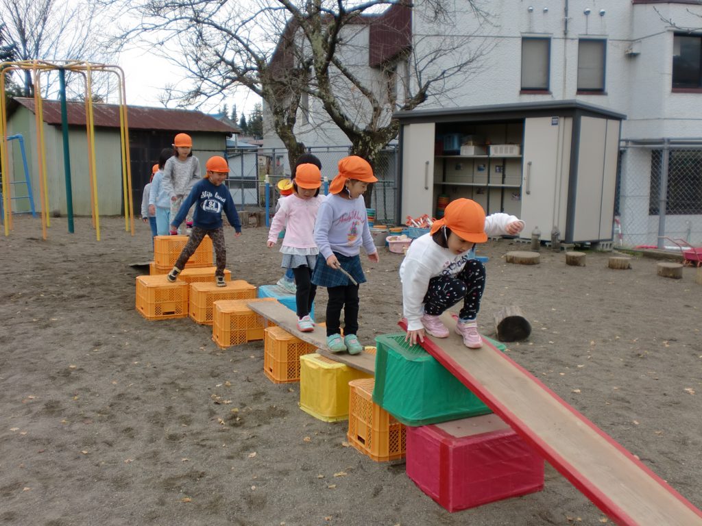 コンテナの箱と木の板を組み合わせ自分達で考えて橋や滑り台を作るのですが、重ねて高さを出したり、並べて置いて長くしてみたりといろいろ変化があります。