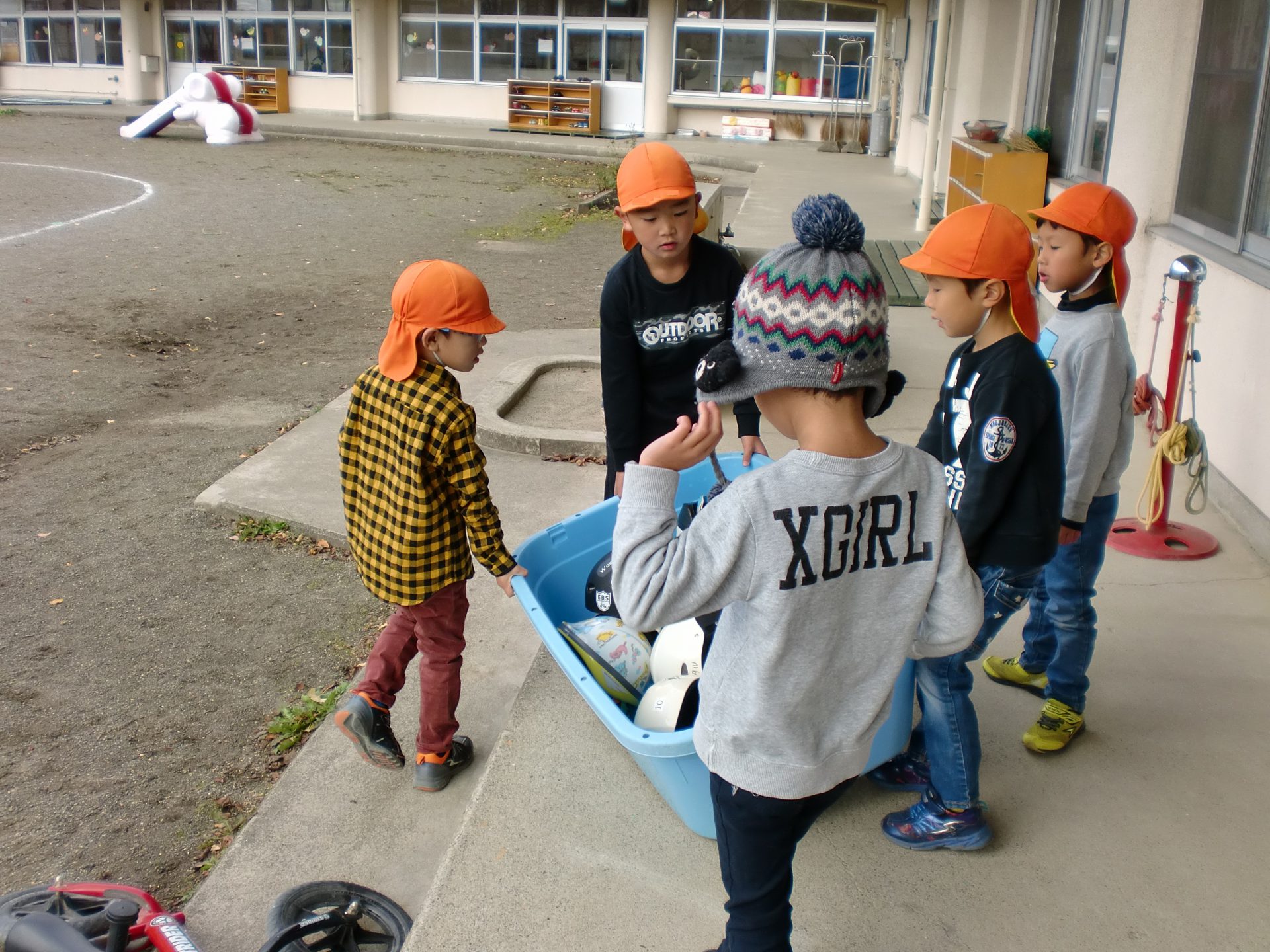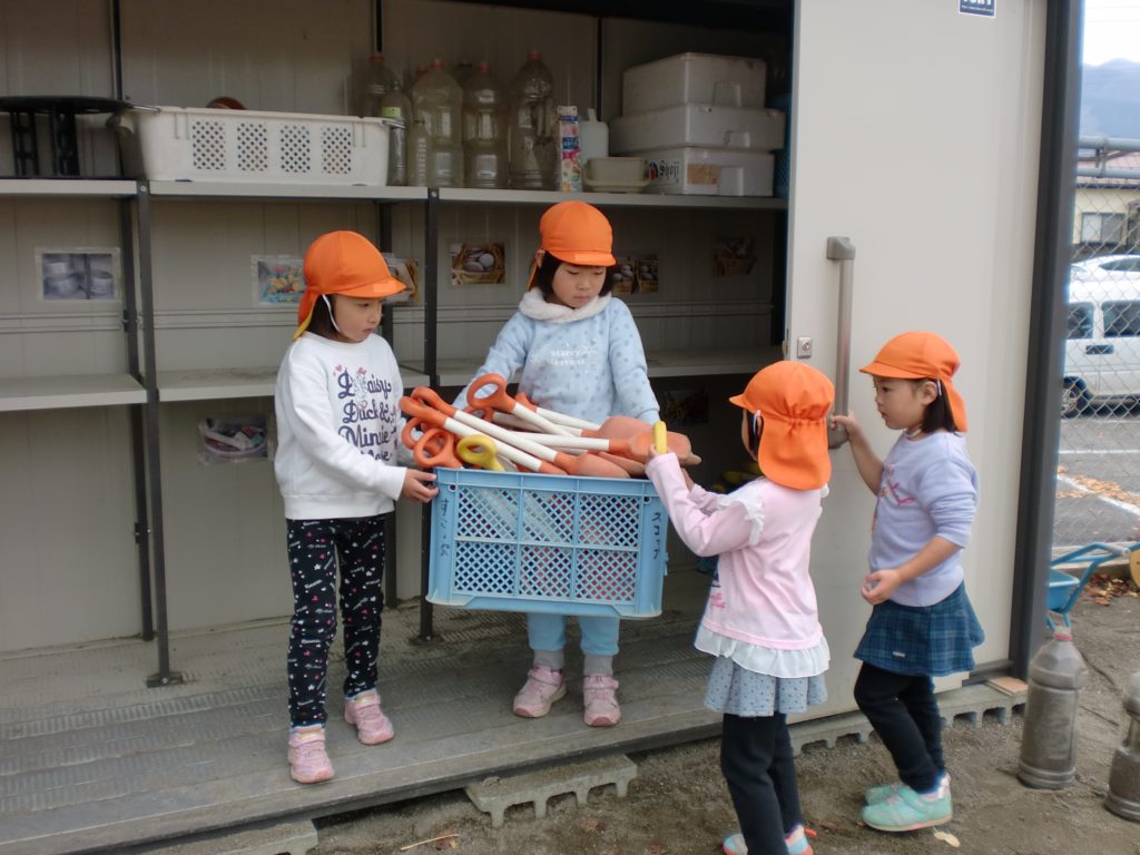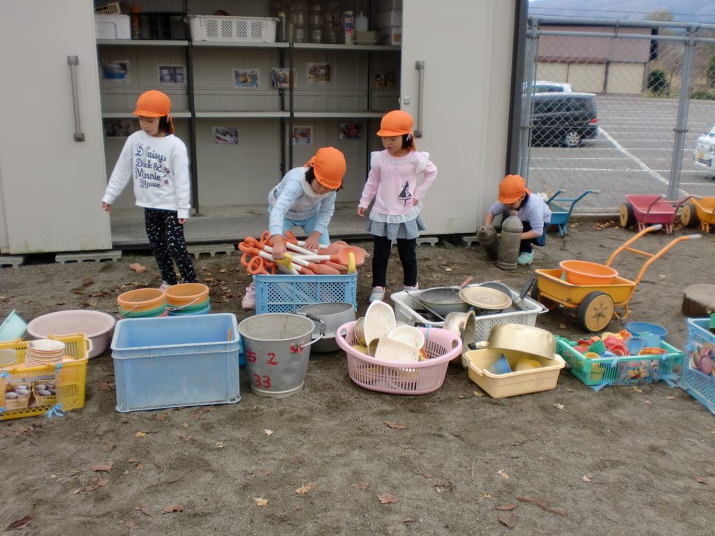 風も冷たくなり、外に出ることをためらいがちですが、子ども達は元気いっぱいで、朝の支度が終わると、外へ出て砂場道具などの準備を始めています。