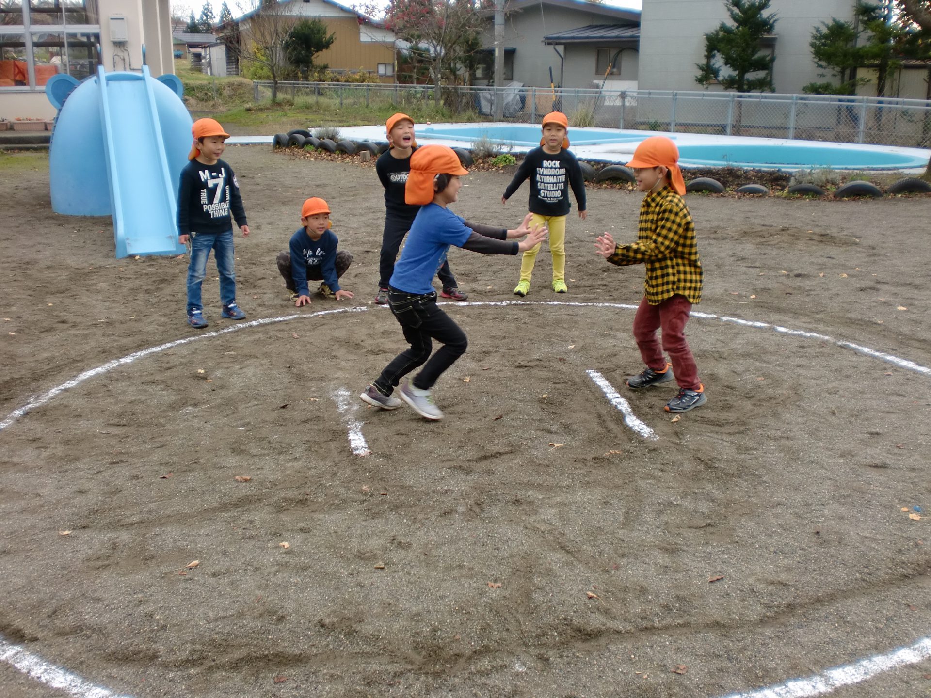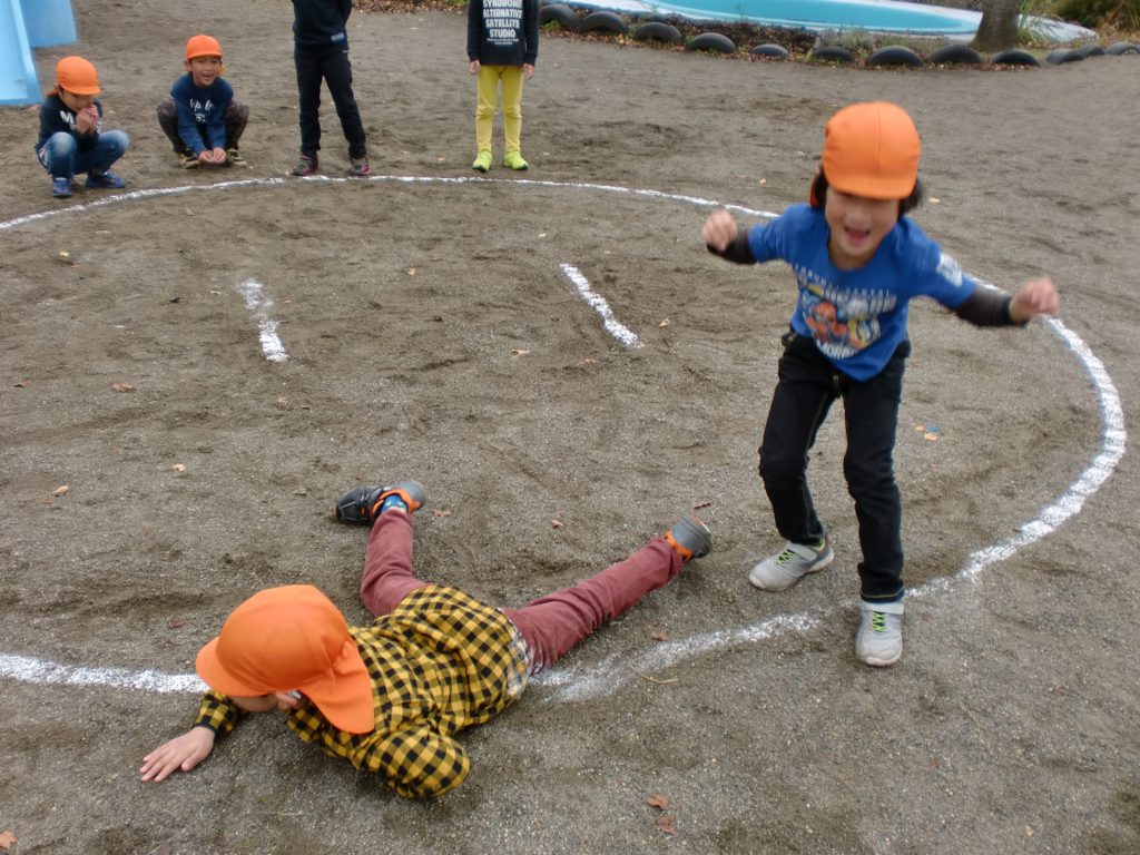 「ここに線書いて」と言う要望があったので子ども達に確認しながら、線を書いていくと土俵が出来上がり、次は誰と誰がやるかが決まると、早速相撲が始まりました。