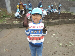 掘っていくなかで、幼虫を見つけたりと、新たな発見もありました。 やきいも大会までのあいだ「やきいも大会まだ~?」と楽しみにする声を聞こえてきました。当日にはとてもいい顔をしてる子ども達がたくさんいました。きっと自分たちで苗を植え育て、収穫したことで子ども達の気持ちも盛り上がったのではないかと思います。 嬉しそうにやきいもを食べる子ども達の姿が見られてよかったです!